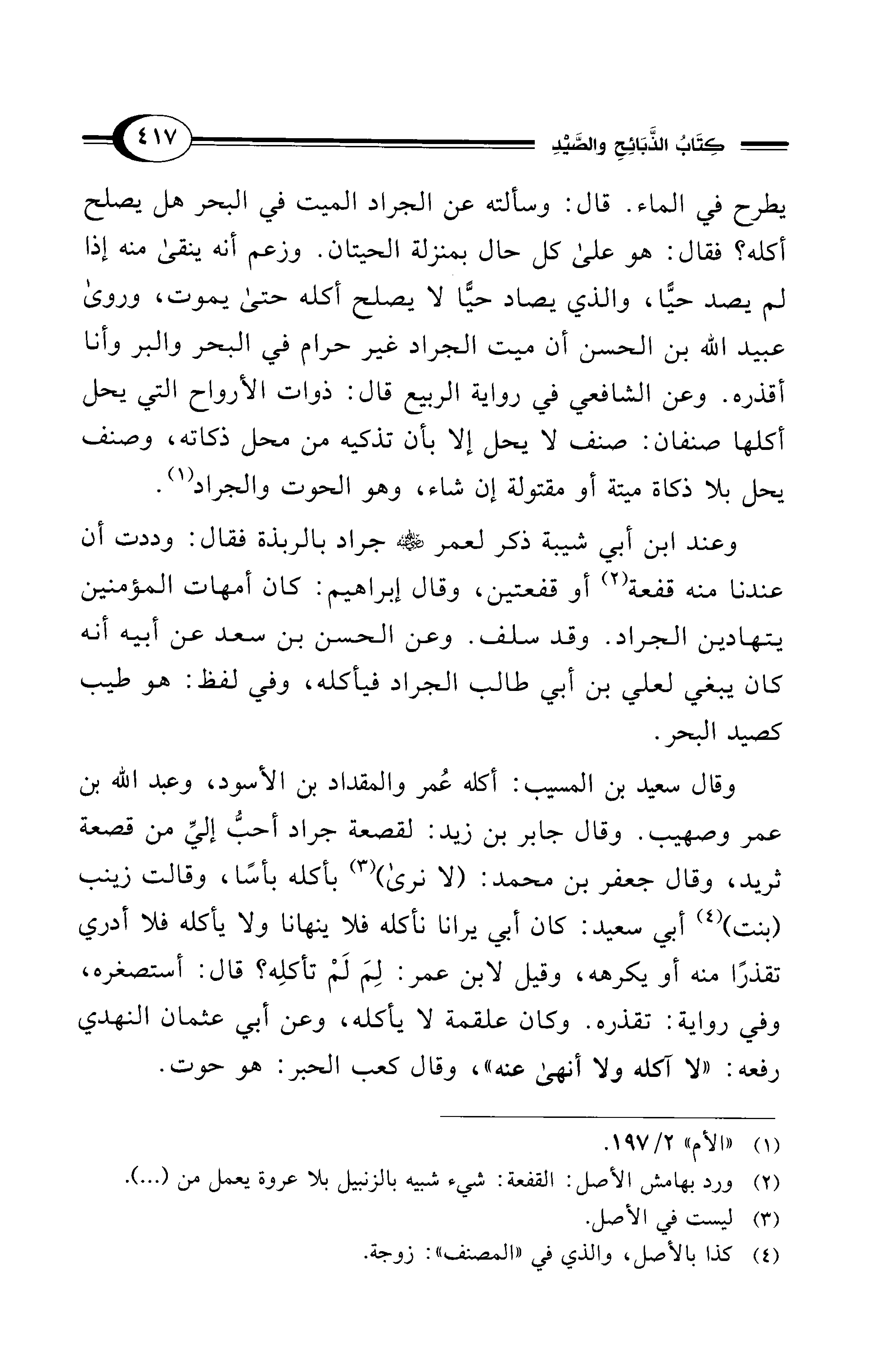 وقال سعيد بن المسيب: أكله عُمر والمقداد بن الأسود، وعبد الله بن عمر وصهيب. وقال جابر بن زيد: لقصعة جراد أحبُّ إليِّ من قصعة ثريد، وقال جعفر بن محمد: (لا نرى) (¬3) بأكله بأسًا، وقالت زينب (بنت) (¬4) أبي سعيد: كان أبي يرانا نأكله فلا ينهانا ولا يأكله فلا أدري تقذرًا منه أو يكرهه، وقيل لابن عمر: لِمَ لَمْ تأكلِه؟ قال: أستصغره، وفي رواية: تقذره. وكان علقمة لا يأكله، وعن أبي عثمان النهدي رفعه: "لا آكله ولا أنهى عنه"، وقال كعب الحبر: هو حوت.