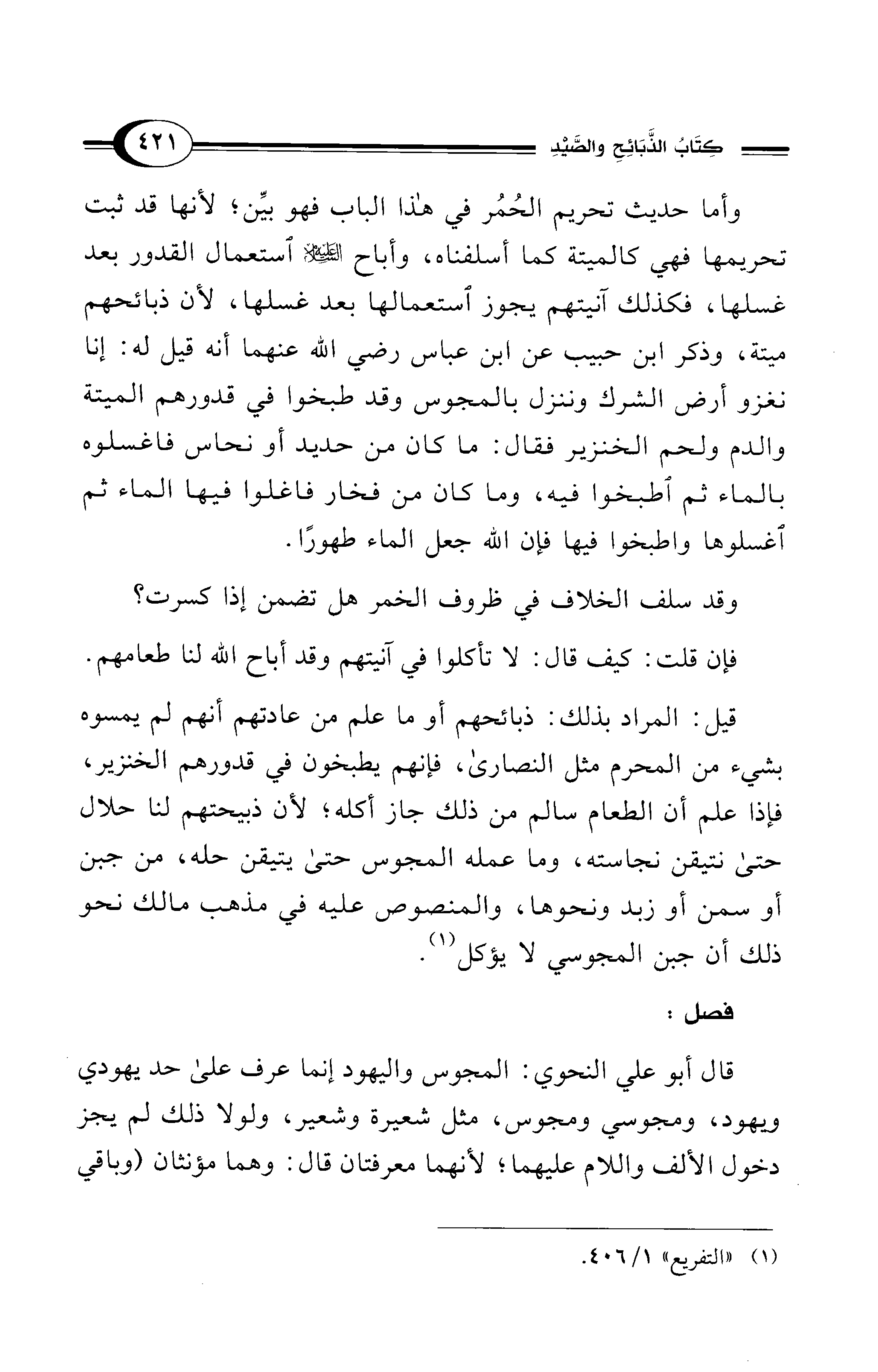 وأما حديث تحريم الحُمُر في هذا الباب فهو بيِّن؛ لأنها قد ثبت تحريمها فهي كالميتة كما أسلفناه، وأباح - عليه السلام - استعمال القدور بعد غسلها، فكذلك آنيتهم يجوز استعمالها بعد غسلها، لأن ذبائحهم ميتة، وذكر ابن حبيب عن ابن عباس - رضي الله عنهما - أنه قيل له: إنا نغزو أرض الشرك وننزل بالمجوس وقد طبخوا في قدورهم الميتة والدم ولحم الخنزير فقال: ما كان من حديد أو نحاس فاغسلوه بالماء ثم اطبخوا فيه، وما كان من فخار فاغلوا فيها الماء ثم اغسلوها واطبخوا فيها فإن الله جعل الماء طهورًا.