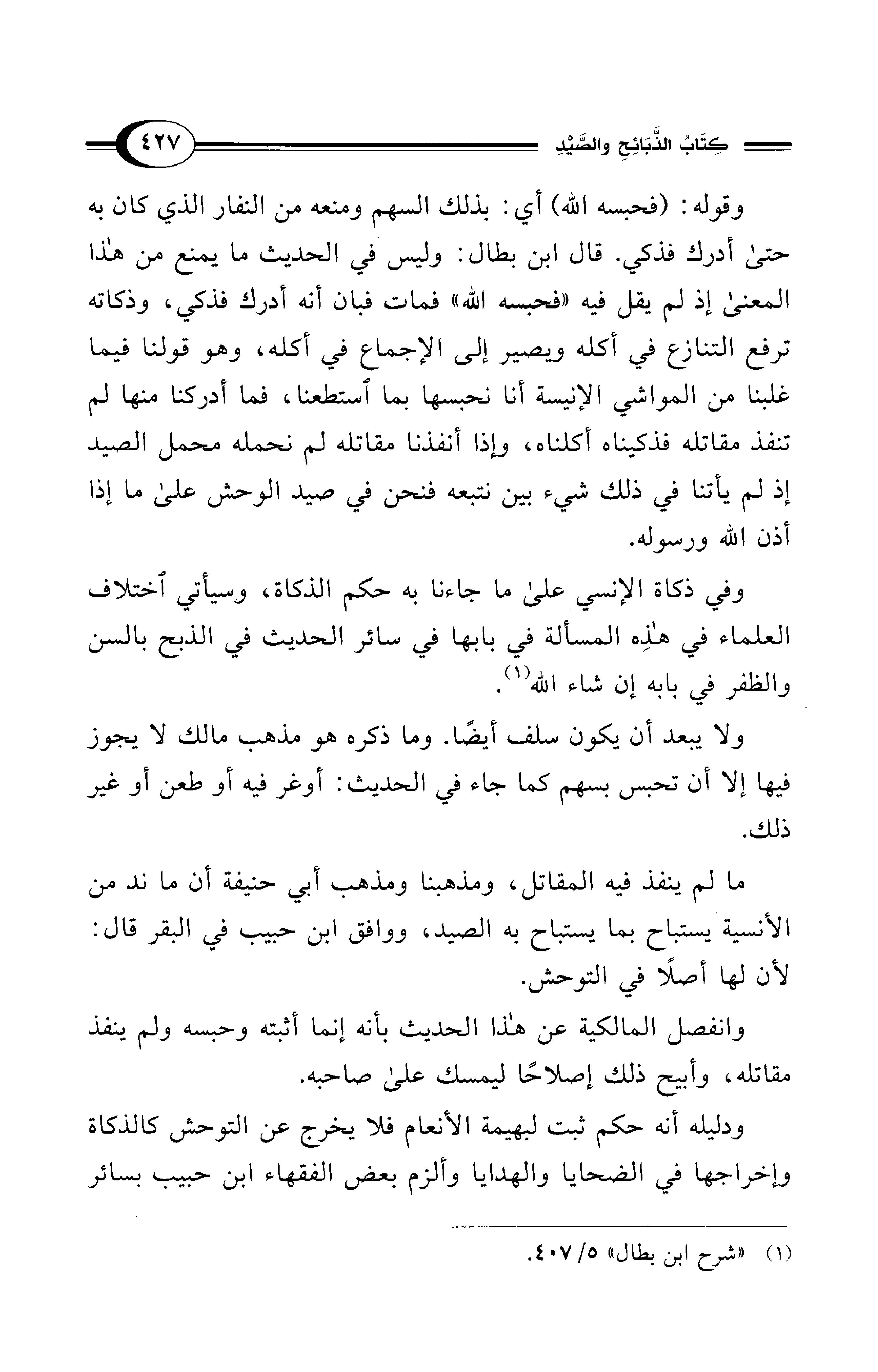 ودليله أنه حكم ثبت لبهيمة الأنعام فلا يخرج عن التوحش كالذكاة وإخراجها في الضحايا والهدايا وألزم بعض الفقهاء ابن حبيب بسائر