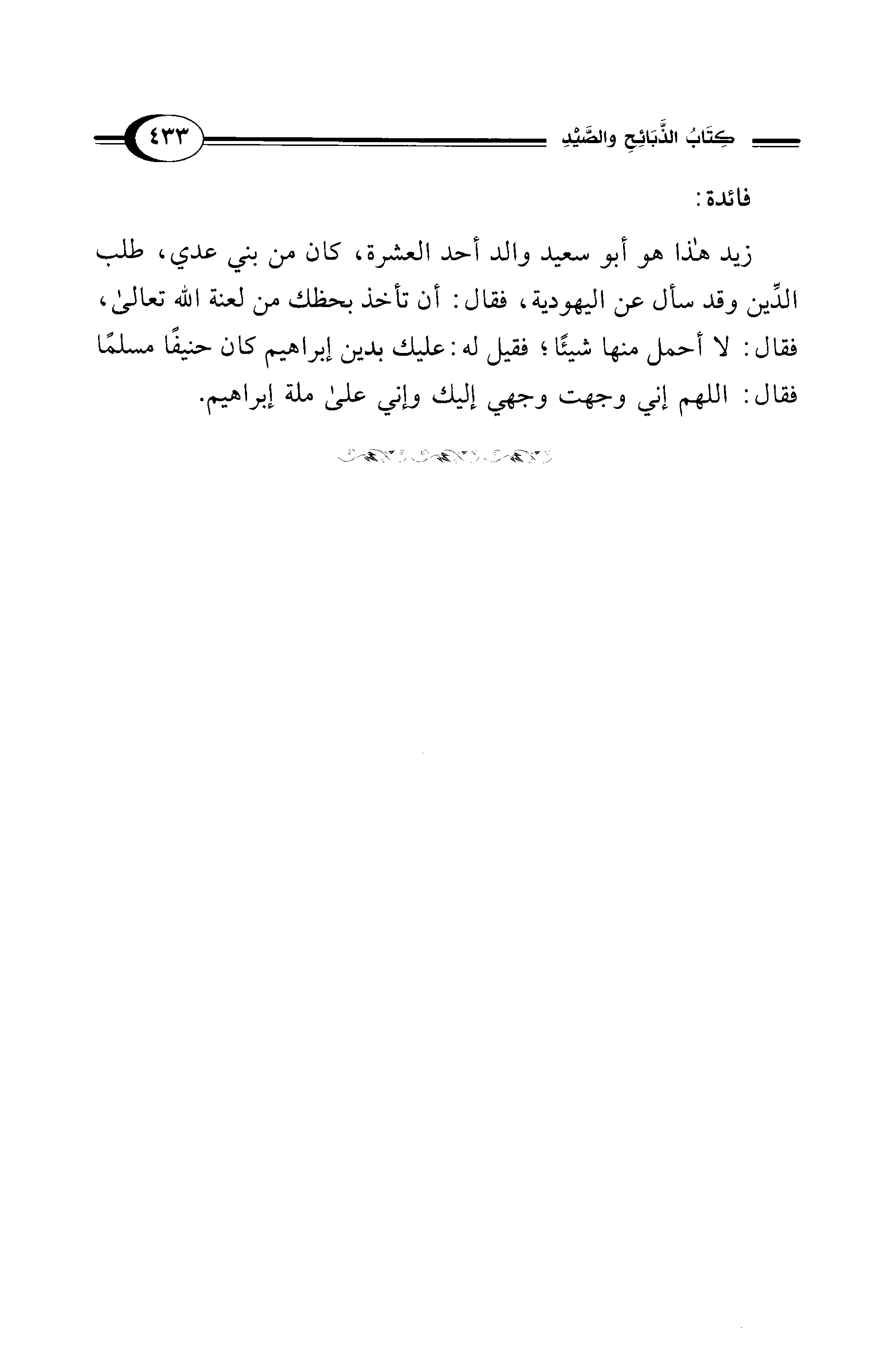 زيد هذا هو أبو سعيد والد أحد العشرة، كان من بني عدي، طلب الدِّين وقد سأل عن اليهودية، فقال: أن تأخذ بحظك من لعنة الله تعالى، فقال: لا أحمل منها شيئًا؛ فقيل له: عليك بدين إبراهيم كان حنيفًا مسلمًا فقال: اللهم إني وجهت وجهي إليك وإني على ملة إبراهيم.