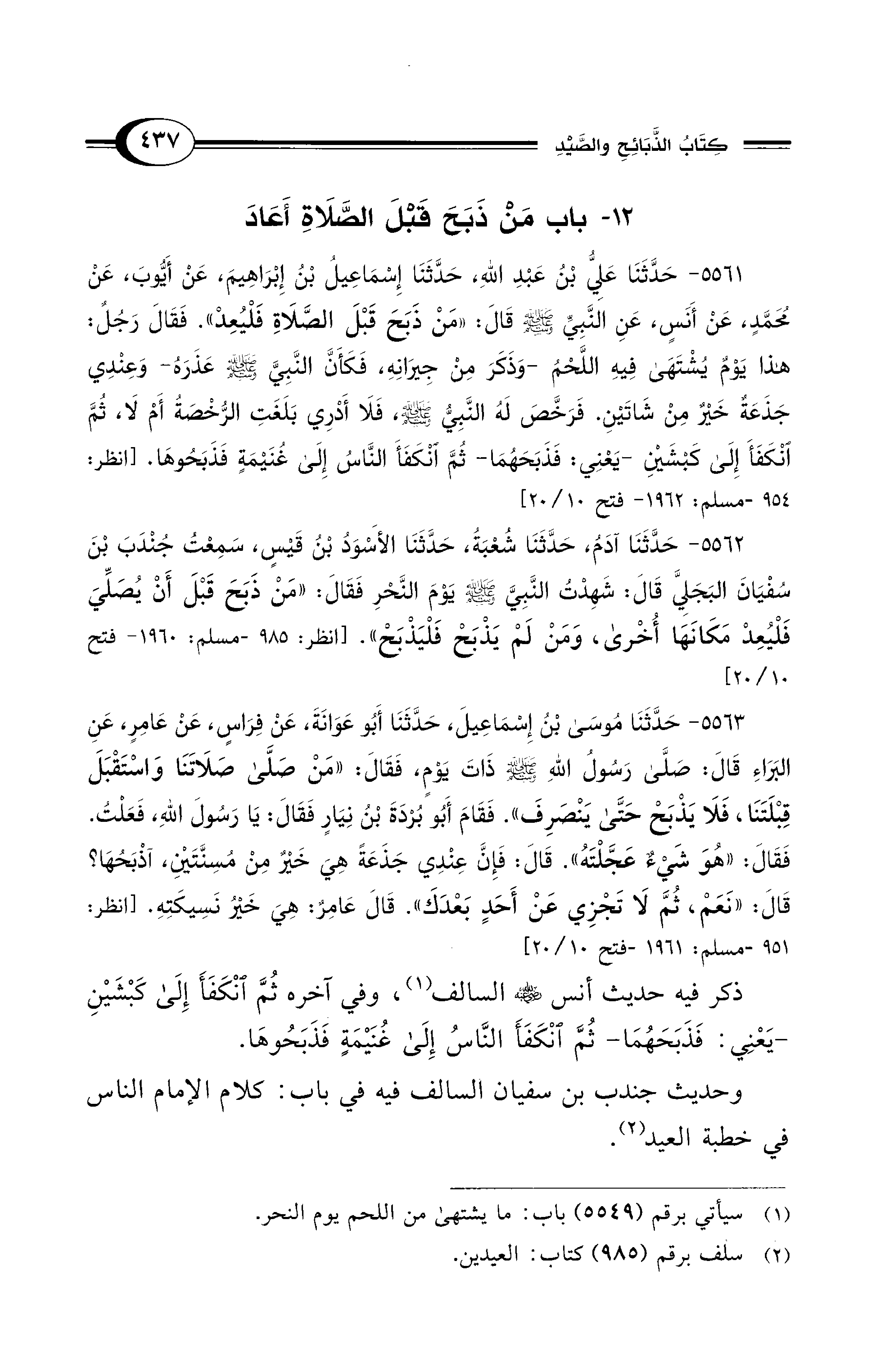 5562 - حَدَّثَنَا آدَمُ، حَدَّثَنَا شُعْبَةُ، حَدَّثَنَا الأَسْوَدُ بْنُ قَيْسٍ، سَمِعْتُ جُنْدَبَ بْنَ سُفْيَانَ الْبَجَلِيَّ قَالَ: شَهِدْتُ النَّبِيَّ - صلى الله عليه وسلم - يَوْمَ النَّحْرِ فَقَالَ: «مَنْ ذَبَحَ قَبْلَ أَنْ يُصَلِّىَ فَلْيُعِدْ مَكَانَهَا أُخْرَى، وَمَنْ لَمْ يَذْبَحْ فَلْيَذْبَحْ». [انظر: 985 - مسلم: 1960 - فتح 10/ 20]