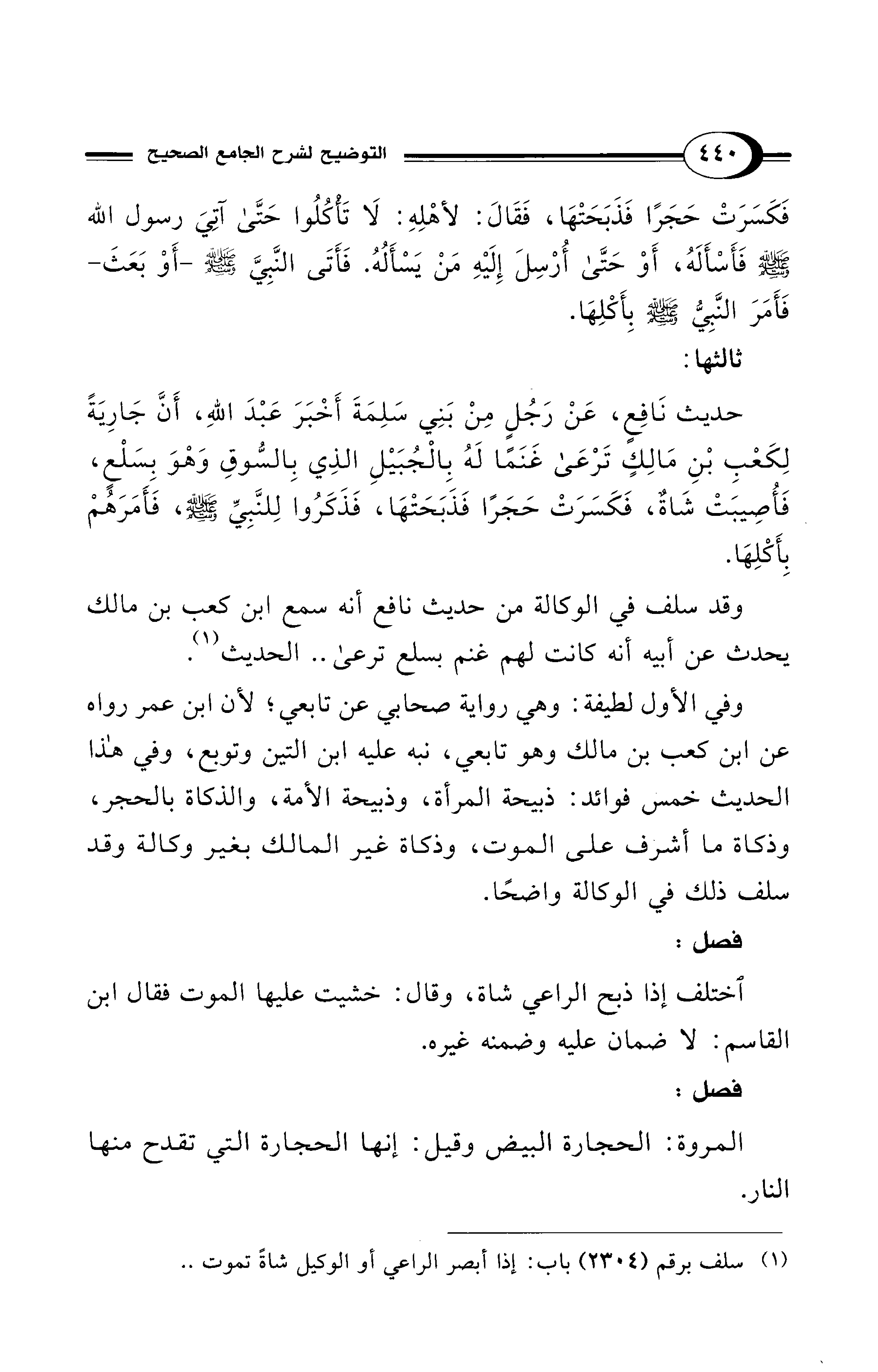 حديث نَافِعٍ، عَنْ رَجُلٍ مِنْ بَنِي سَلِمَةَ أَخْبَرَ عَبْدَ اللهِ، أَنَّ جَارِيَةً لِكَعْبِ بْنِ مَالِكٍ تَرْعَى غَنَمًا لَهُ بِالْجُبَيْلِ الذِي بِالسُّوقِ وَهْوَ بِسَلْعٍ، فَأُصِيبَتْ شَاةٌ، فَكَسَرَتْ حَجَرًا فَذَبَحَتْهَا، فَذَكَرُوا لِلنَّبِيِّ - صلى الله عليه وسلم -، فَأَمَرَهُمْ بِأَكْلِهَا.