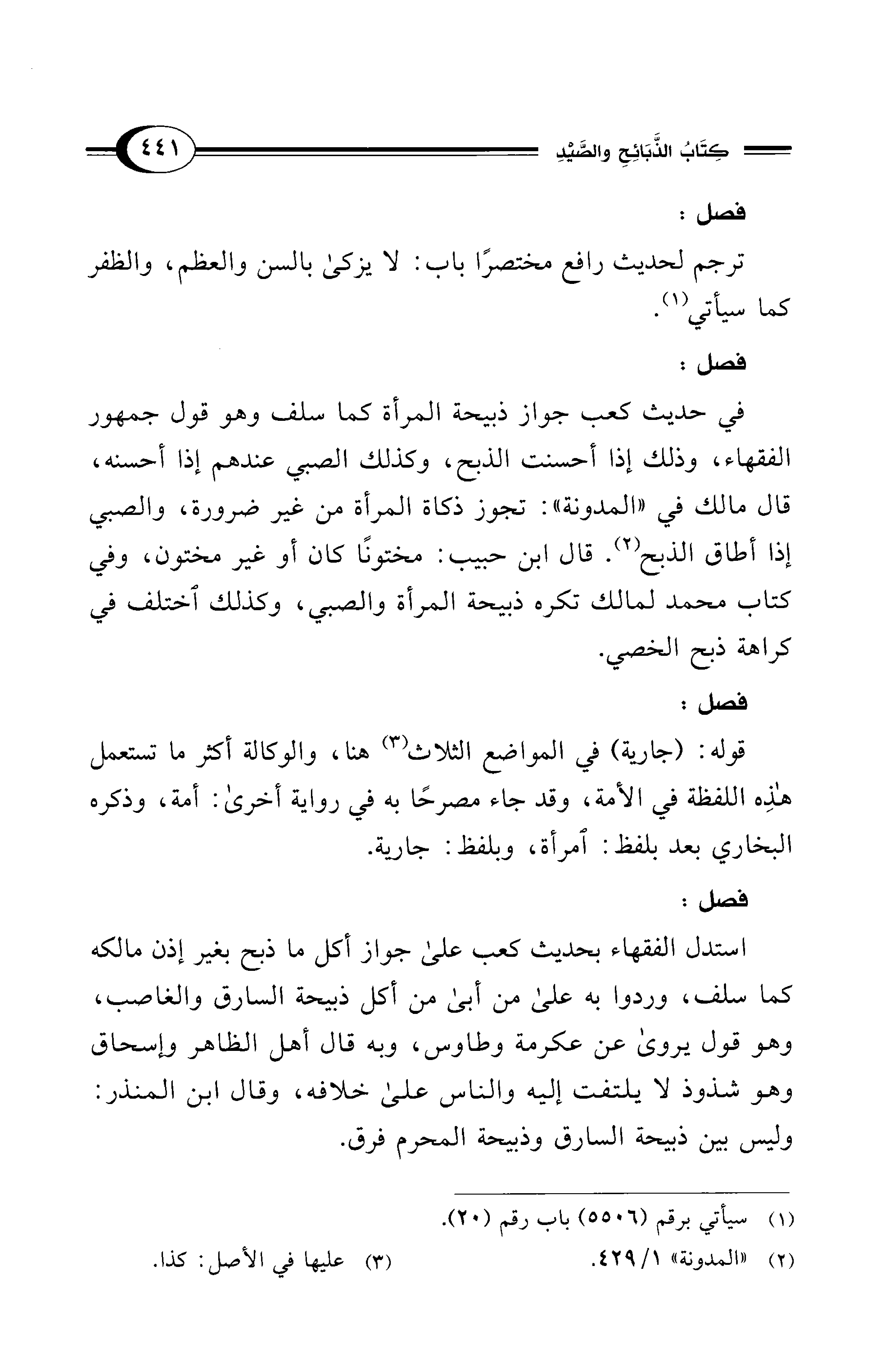 في حديث كعب جواز ذبيحة المرأة كما سلف وهو قول جمهور الفقهاء، وذلك إذا أحسنت الذبح، وكذلك الصبي عندهم إذا أحسنه، قال مالك في "المدونة": تجوز ذكاة المرأة من غير ضرورة، والصبي إذا أطاق الذبح (¬2). قال ابن حبيب: مختونًا كان أو غير مختون، وفي كتاب محمد لمالك تكره ذبيحة المرأة والصبي، وكذلك اختلف في كراهة ذبح الخصي.