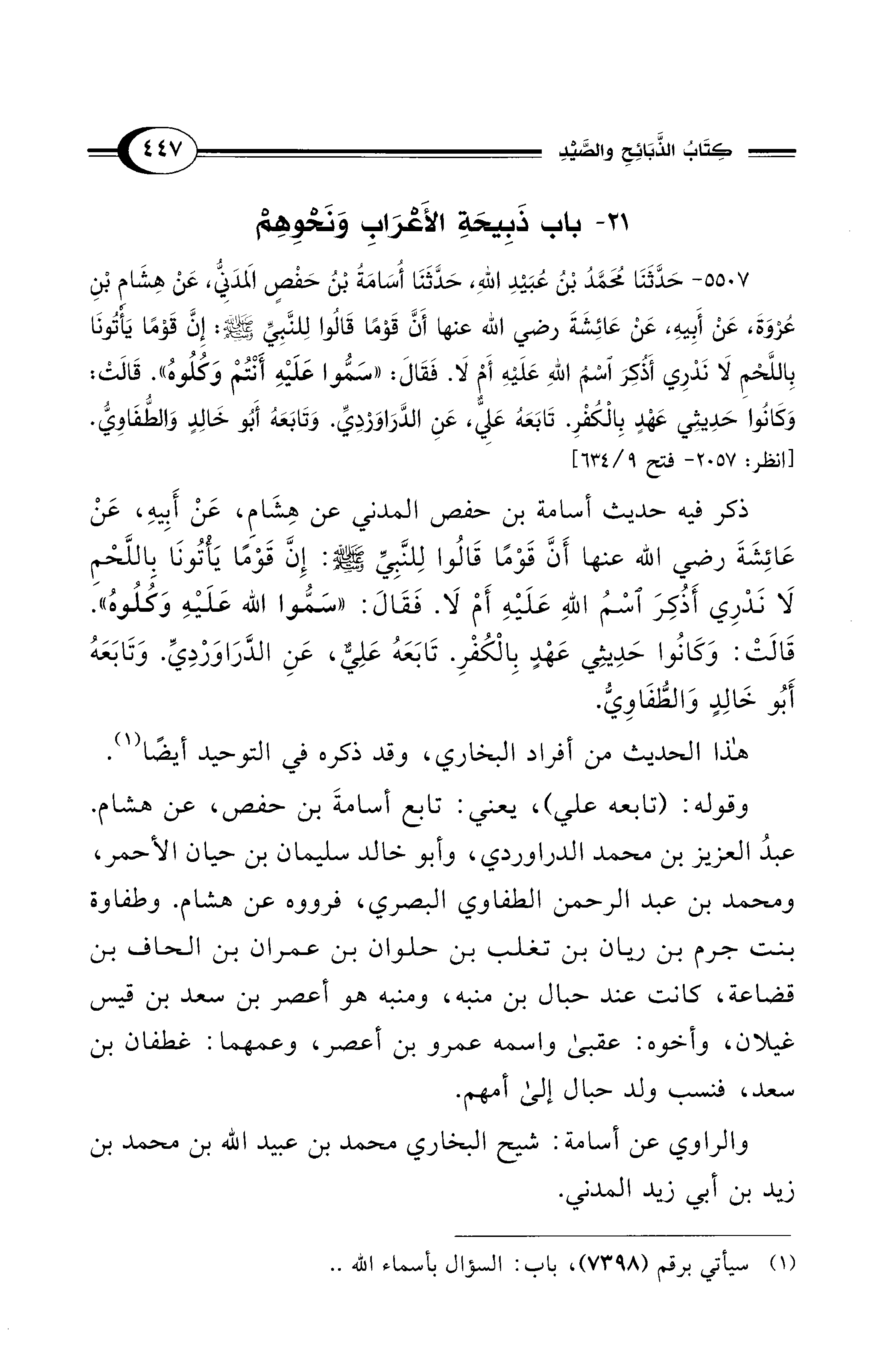 5507 - حَدَّثَنَا مُحَمَّدُ بْنُ عُبَيْدِ اللهِ، حَدَّثَنَا أُسَامَةُ بْنُ حَفْصٍ الْمَدَنِيُّ، عَنْ هِشَامِ بْنِ عُرْوَةَ، عَنْ أَبِيهِ، عَنْ عَائِشَةَ - رضي الله عنها - أَنَّ قَوْمًا قَالُوا لِلنَّبِيِّ - صلى الله عليه وسلم -: إِنَّ قَوْمًا يَأْتُونَا بِاللَّحْمِ لاَ نَدْرِي أَذُكِرَ اسْمُ اللهِ عَلَيْهِ أَمْ لاَ. فَقَالَ: «سَمُّوا عَلَيْهِ أَنْتُمْ وَكُلُوهُ». قَالَتْ: وَكَانُوا حَدِيثِي عَهْدٍ بِالْكُفْرِ. تَابَعَهُ عَلِيٌّ، عَنِ الدَّرَاوَرْدِيِّ. وَتَابَعَهُ أَبُو خَالِدٍ وَالطُّفَاوِيُّ. [انظر: 2057 - فتح 9/ 634]