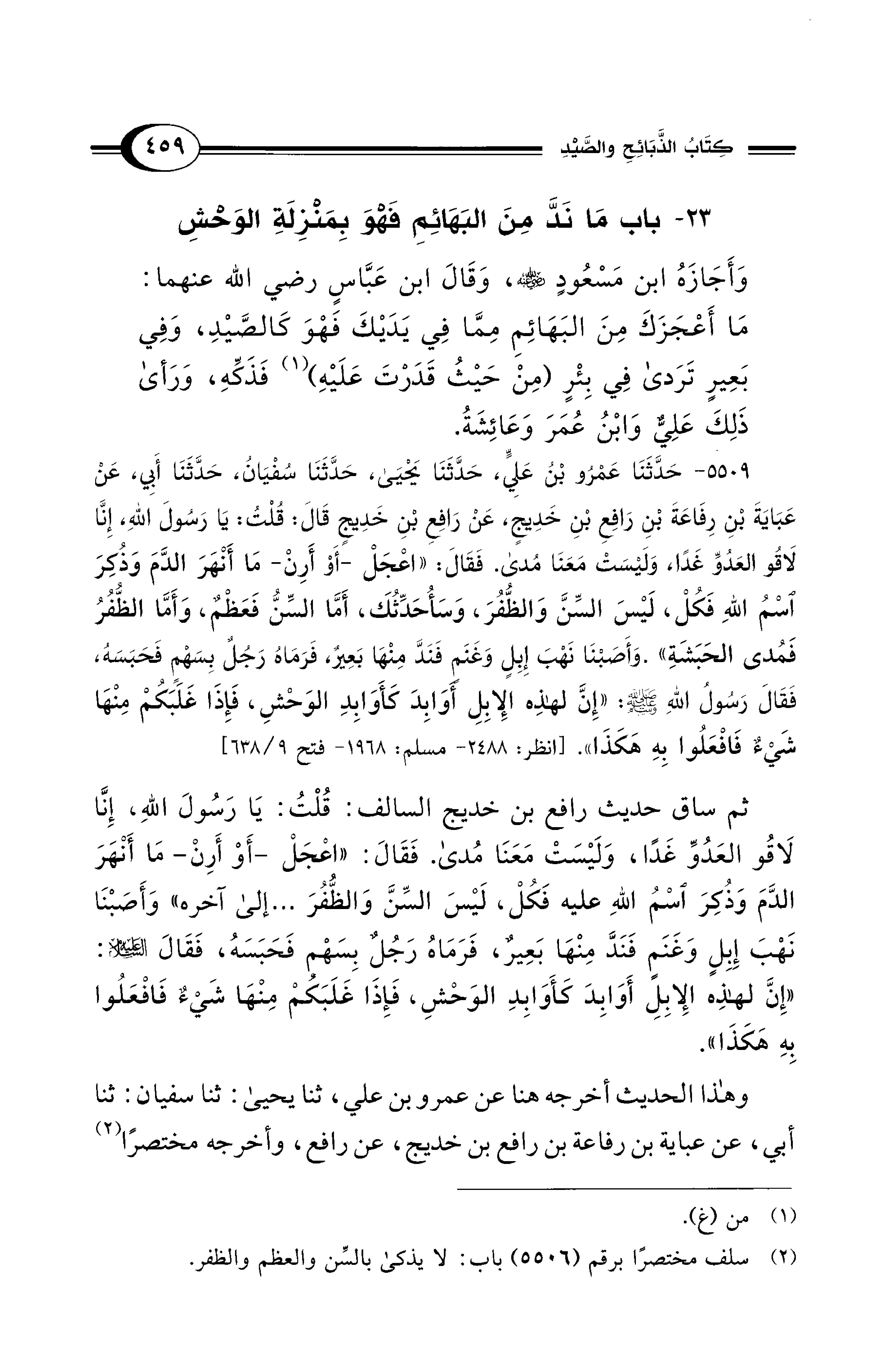 ثم ساق حديث رافع بن خديج السالف: قُلْتُ: يَا رَسُولَ اللهِ، إِنَّا لَاقُو العَدُوِّ غَدًا، وَلَيْسَتْ مَعَنَا مُدى. فَقَالَ: "اعْجَلْ -أَوْ أَرِنْ- مَا أَنْهَرَ الدَّمَ وَذُكِرَ اسْمُ اللهِ عليه فَكُلْ، لَيسَ السِّنَّ وَالظُّفُرَ ... إلى آخره" وَأَصَبْنَا نَهْبَ إِبِلٍ وَغَنَمٍ فَنَدَّ مِنْهَا بَعِيرٌ، فَرَمَاهُ رَجُلٌ بِسَهْم فَحَبَسَهُ، فَقَالَ - عليه السلام -: "إِنَّ لهذِه الإِبِلِ أَوَابِدَ كَأَوَابِدِ الوَحْشِ، فَإِذَا غَلَبَكُمْ مِنْهَا شَيْءٌ فَافْعَلُوا بِهِ هَكَذَا".