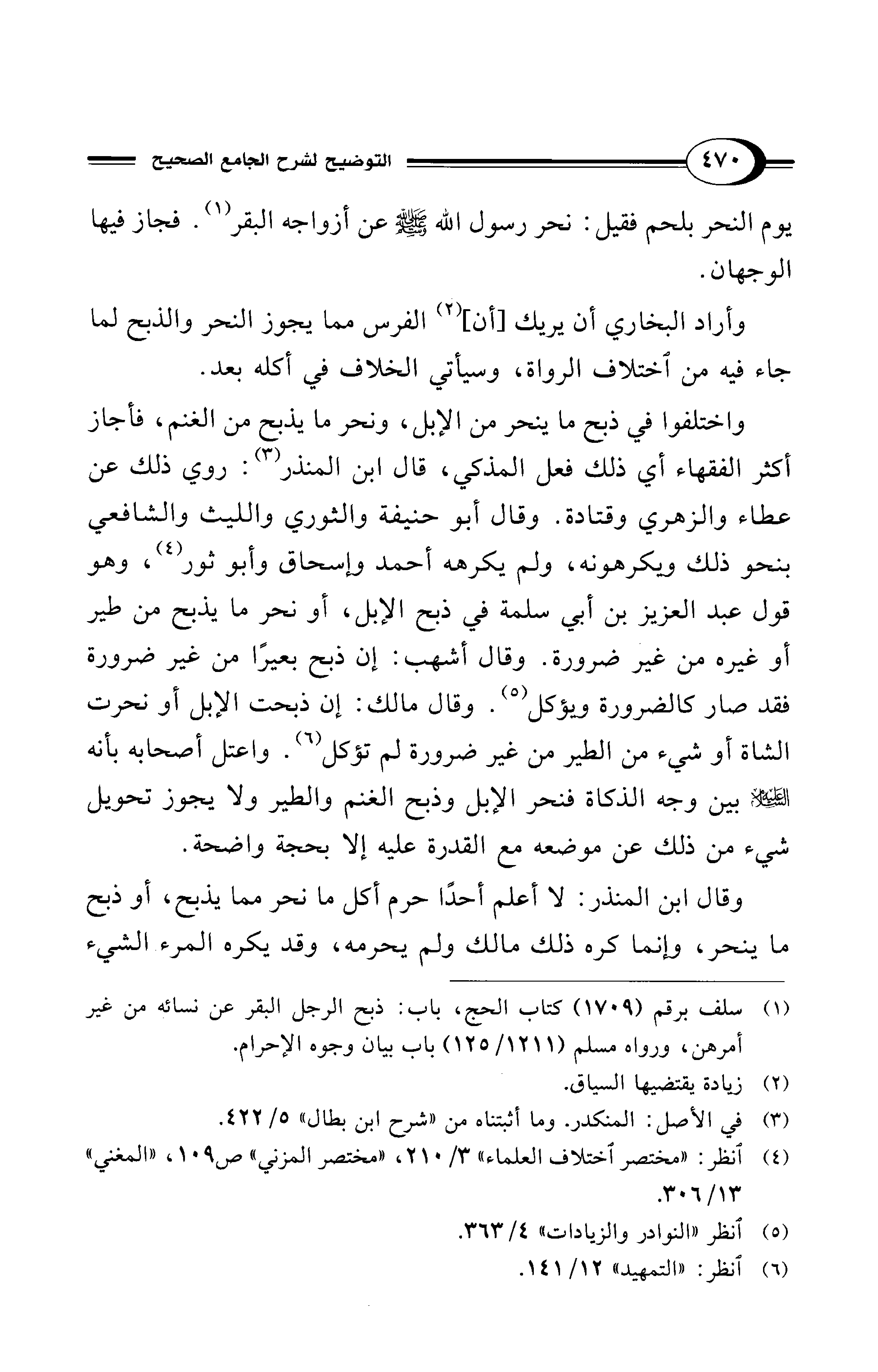وقال ابن المنذر: لا أعلم أحدًا حرم أكل ما نحر مما يذبح، أو ذبح ما ينحر، وإنما كره ذلك مالك ولم يحرمه، وقد يكره المرء الشيء