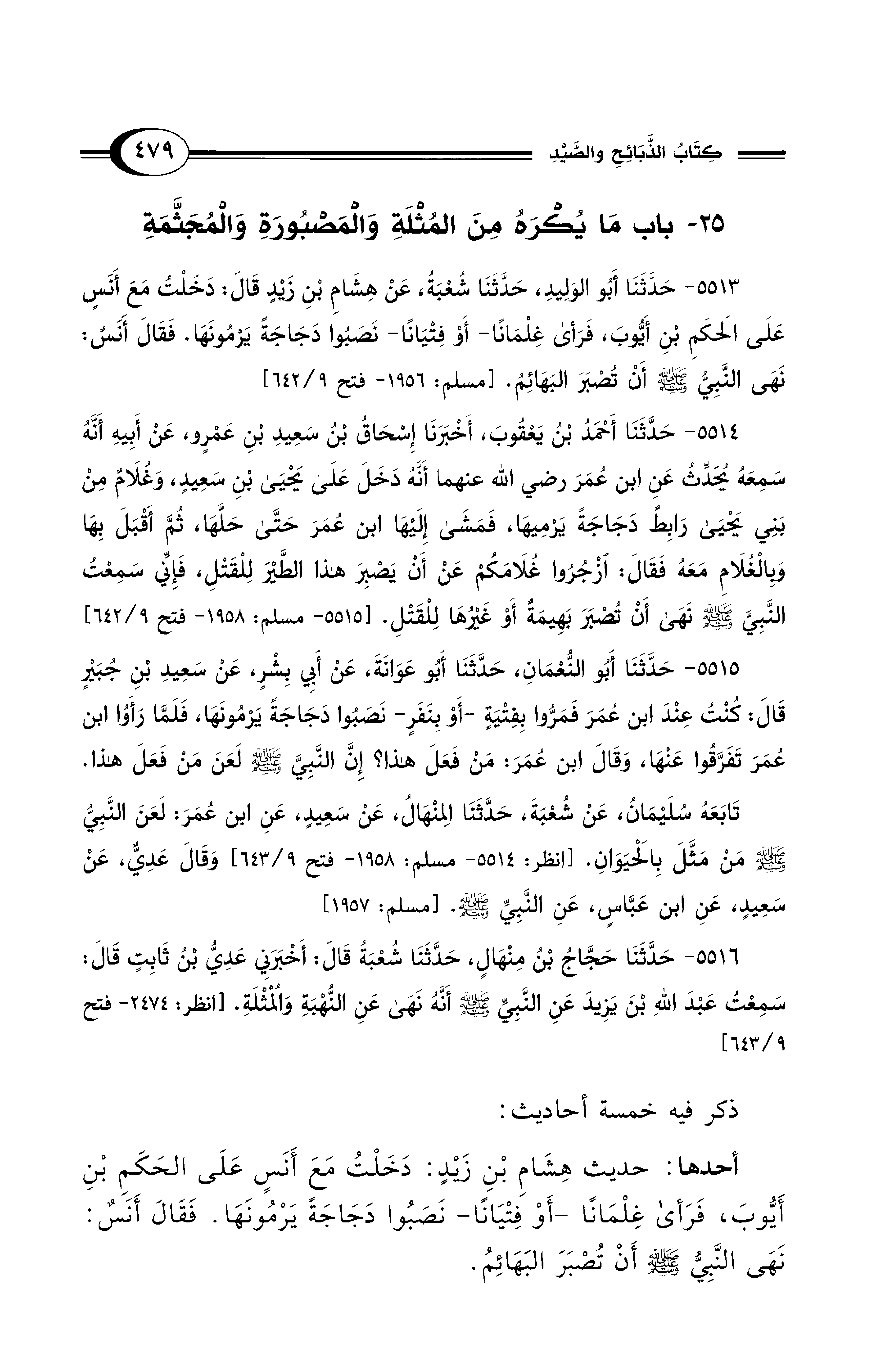 5513 - حَدَّثَنَا أَبُو الْوَلِيدِ، حَدَّثَنَا شُعْبَةُ، عَنْ هِشَامِ بْنِ زَيْدٍ قَالَ: دَخَلْتُ مَعَ أَنَسٍ عَلَى الْحَكَمِ بْنِ أَيُّوبَ، فَرَأَى غِلْمَانًا -أَوْ فِتْيَانًا- نَصَبُوا دَجَاجَةً يَرْمُونَهَا. فَقَالَ أَنَسٌ: نَهَى النَّبِيُّ - صلى الله عليه وسلم - أَنْ تُصْبَرَ الْبَهَائِمُ. [مسلم: 1956 - فتح 9/ 642]