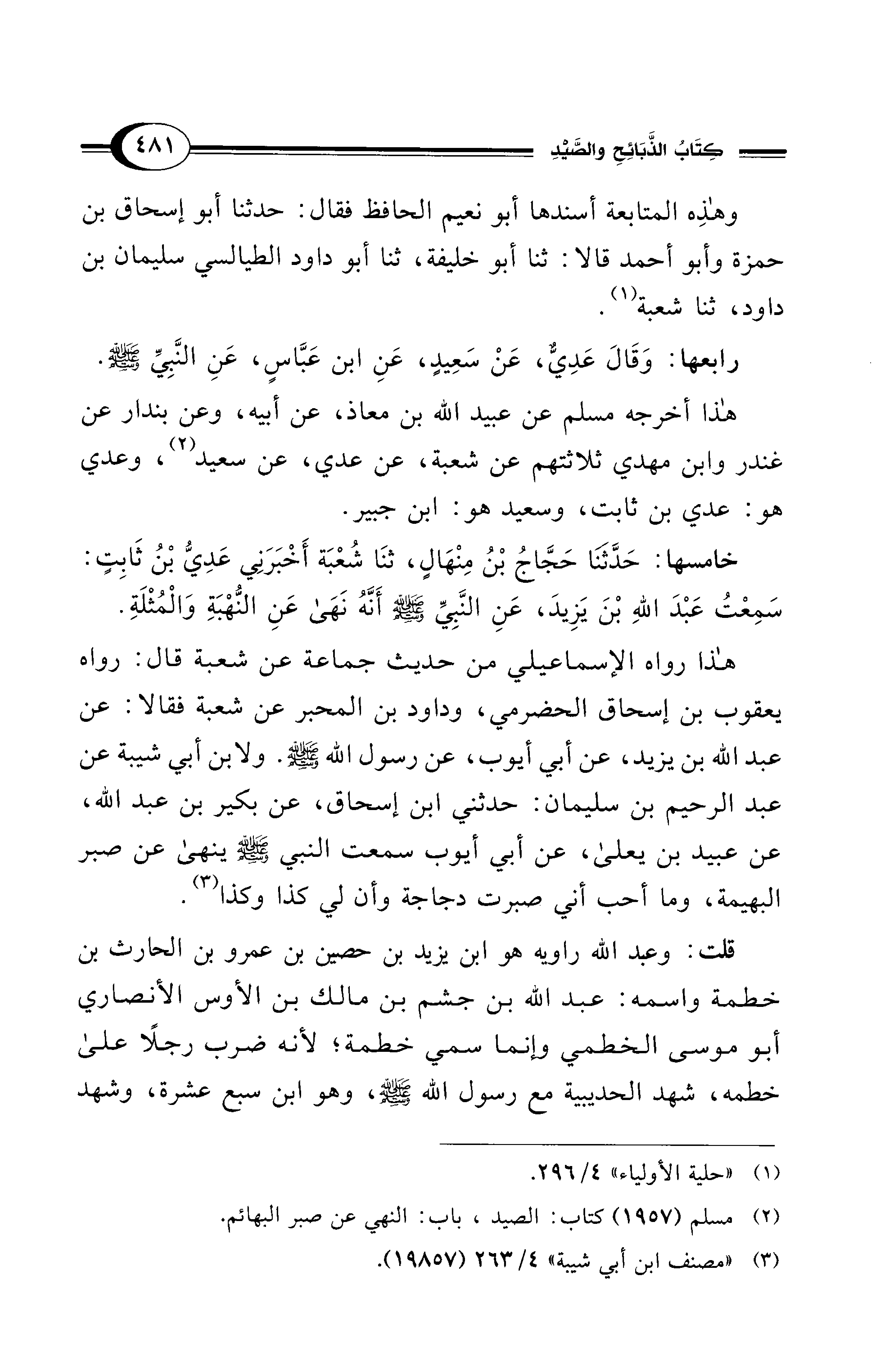 هذا رواه الإسماعيلي من حديث جماعة عن شعبة قال: رواه يعقوب بن إسحاق الحضرمي، وداود بن المحبر عن شعبة فقالا: عن عبد الله بن يزيد، عن أبي أيوب، عن رسول الله - صلى الله عليه وسلم -. ولابن أبي شيبة عن عبد الرحيم بن سليمان: حدثني ابن إسحاق، عن بكير بن عبد الله، عن عبيد بن يعلى، عن أبي أيوب سمعت النبي - صلى الله عليه وسلم - ينهى عن صبر البهيمة، وما أحب أني صبرت دجاجة وأن لي كذا وكذا (¬3).