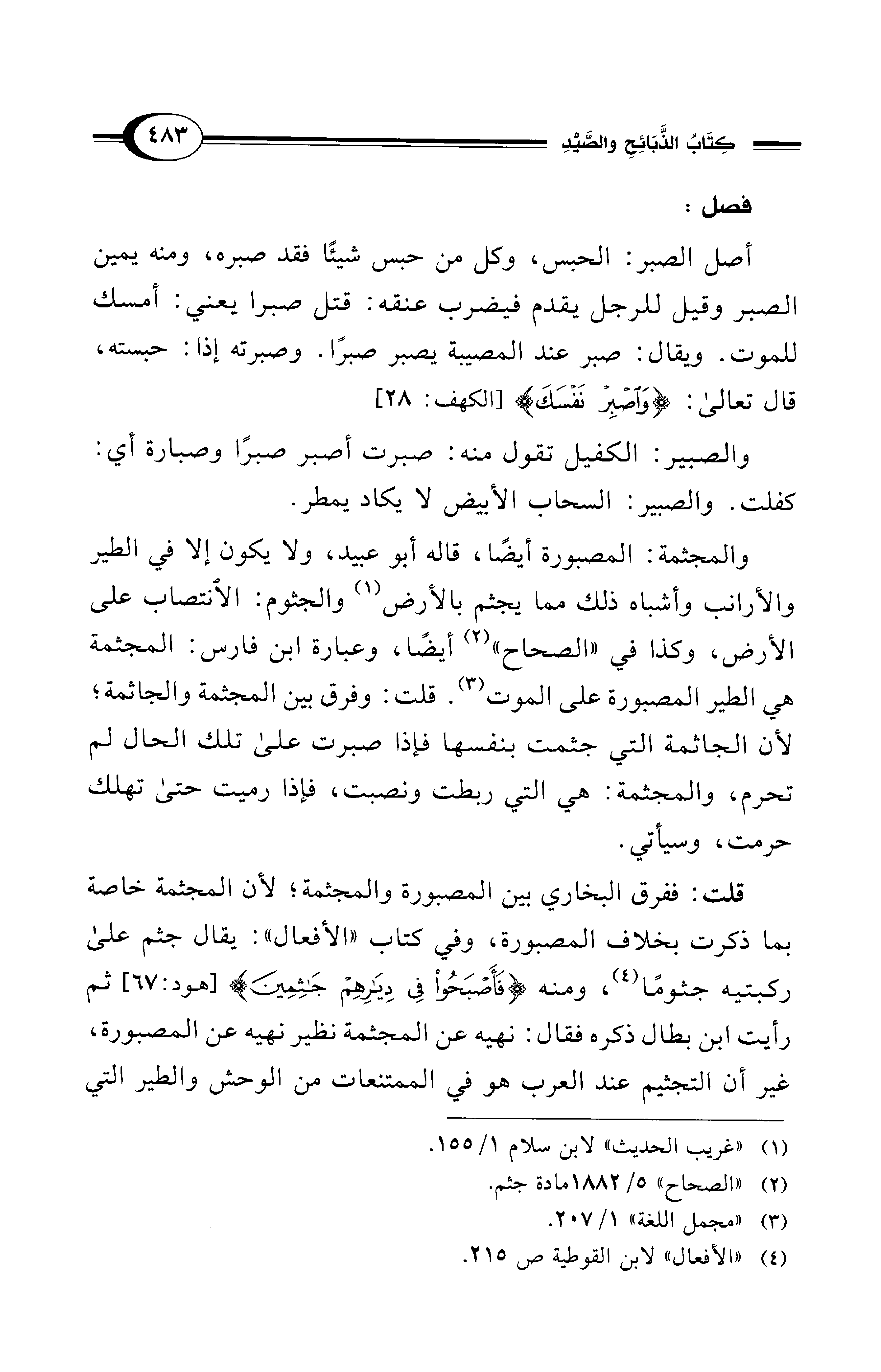 قلت: ففرق البخاري بين المصبورة والمجثمة؛ لأن المجثمة خاصة بما ذكرت بخلاف المصبورة، وفي كتاب "الأفعال": يقال جثم على ركبتيه جثومًا (¬4)، ومنه {فَأَصْبَحُوا فِي دِيَارِهِمْ جَاثِمِينَ} [هود: 67] ثم رأيت ابن بطال ذكره فقال: نهيه عن المجثمة نظير نهيه عن المصبورة، غير أن التجثيم عند العرب هو في الممتنعات من الوحش والطير التي