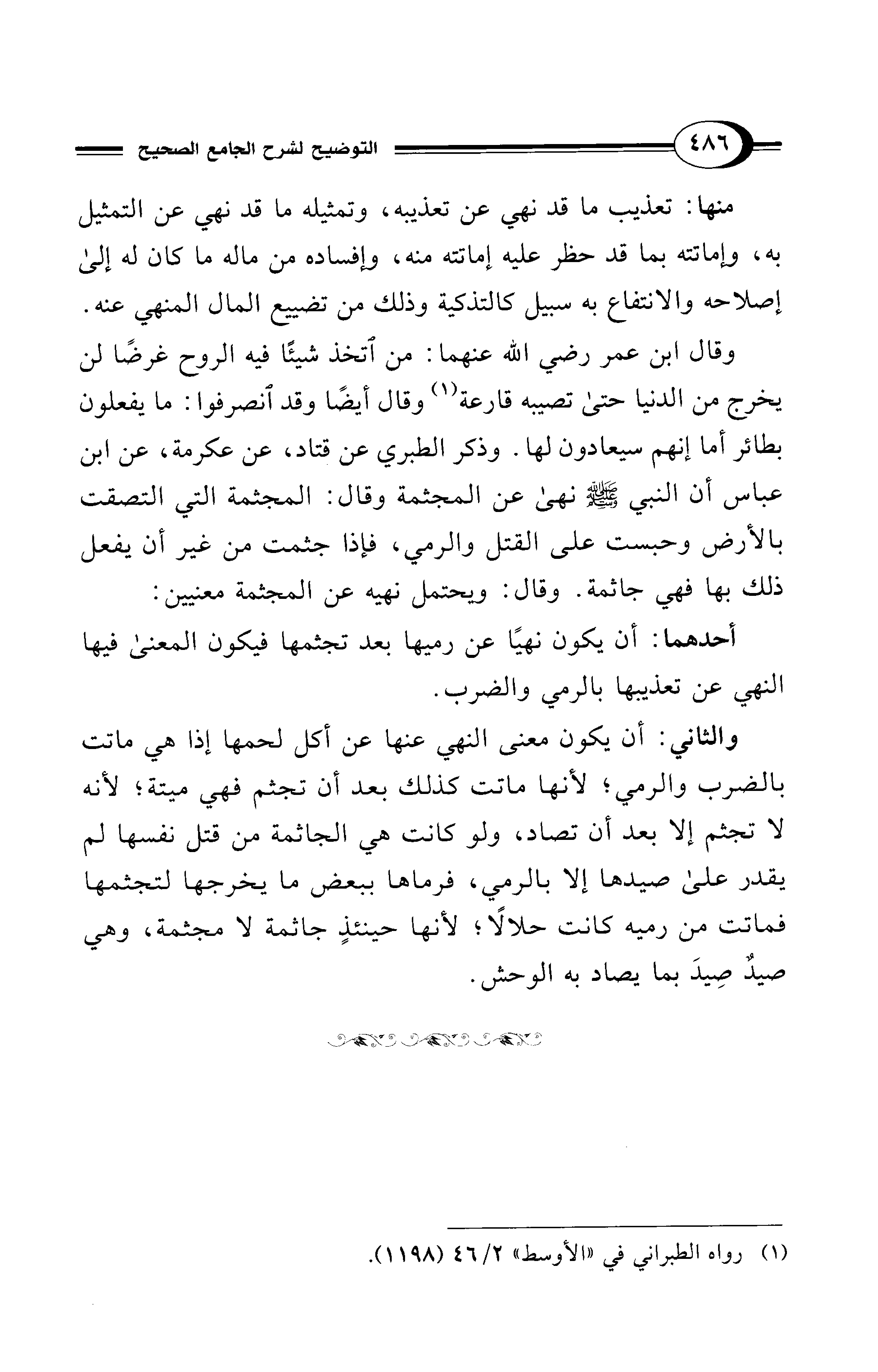 وقال ابن عمر - رضي الله عنهما -: من اتخذ شيئًا فيه الروح غرضًا لن يخرج من الدنيا حتى تصيبه قارعة (¬1) وقال أيضًا وقد انصرفوا: ما يفعلون بطائر أما إنهم سيعادون لها. وذكر الطبري عن قتاد، عن عكرمة، عن ابن عباس أن النبي - صلى الله عليه وسلم - نهى عن المجثمة وقال: المجثمة التي التصقت بالأرض وحبست على القتل والرمي، فإذا جثمت من غير أن يفعل ذلك بها فهي جاثمة. وقال: ويحتمل نهيه عن المجثمة معنيين: