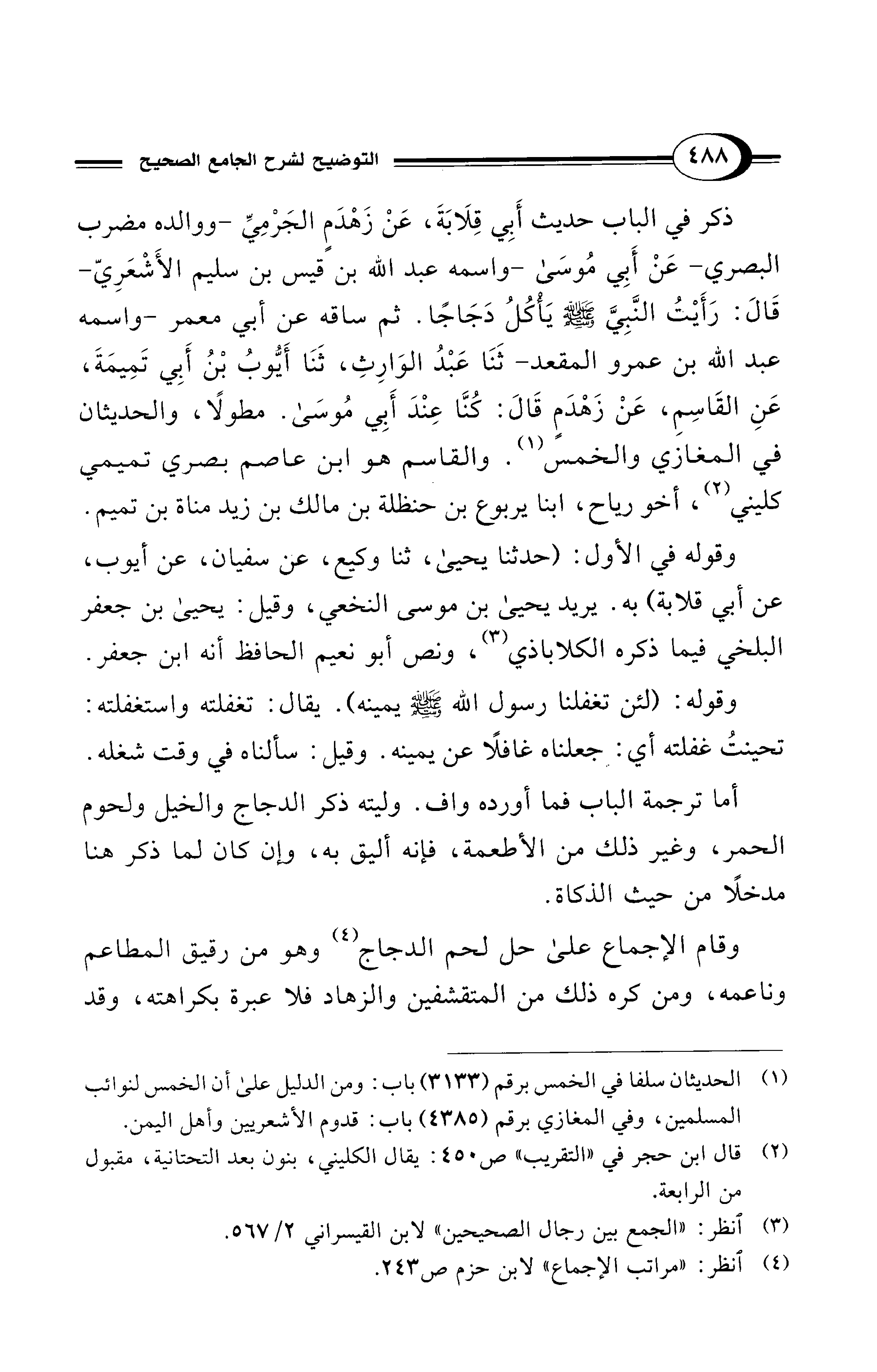 ذكر في الباب حديث أَبِي قِلَابَةَ، عَنْ زَهْدَمٍ الجَرْمِيِّ -ووالده مضرب البصري- عَنْ أَبِي مُوسَى -واسمه عبد الله بن قيس بن سليم الأَشْعَرِيّ- قَالَ: رَأَيْتُ النَّبِيَّ - صلى الله عليه وسلم - يَأْكُلُ دَجَاجًا. ثم ساقه عن أبي معمر -واسمه عبد الله بن عمرو المقعد- ثَنَا عَبْدُ الوَارِثِ، ثَنَا أَيُّوبُ بْنُ أَبِي تَمِيمَةَ، عَنِ القَاسِمِ، عَنْ زَهْدَمٍ قَالَ: كُنَّا عِنْدَ أَبِي مُوسَى. مطولاً، والحديثان في المغازي والخمس (¬1). والقاسم هو ابن عاصم بصري تميمي كليني (¬2)، أخو رياح، ابنا يربوع بن حنظلة بن مالك بن زيد مناة بن تميم.