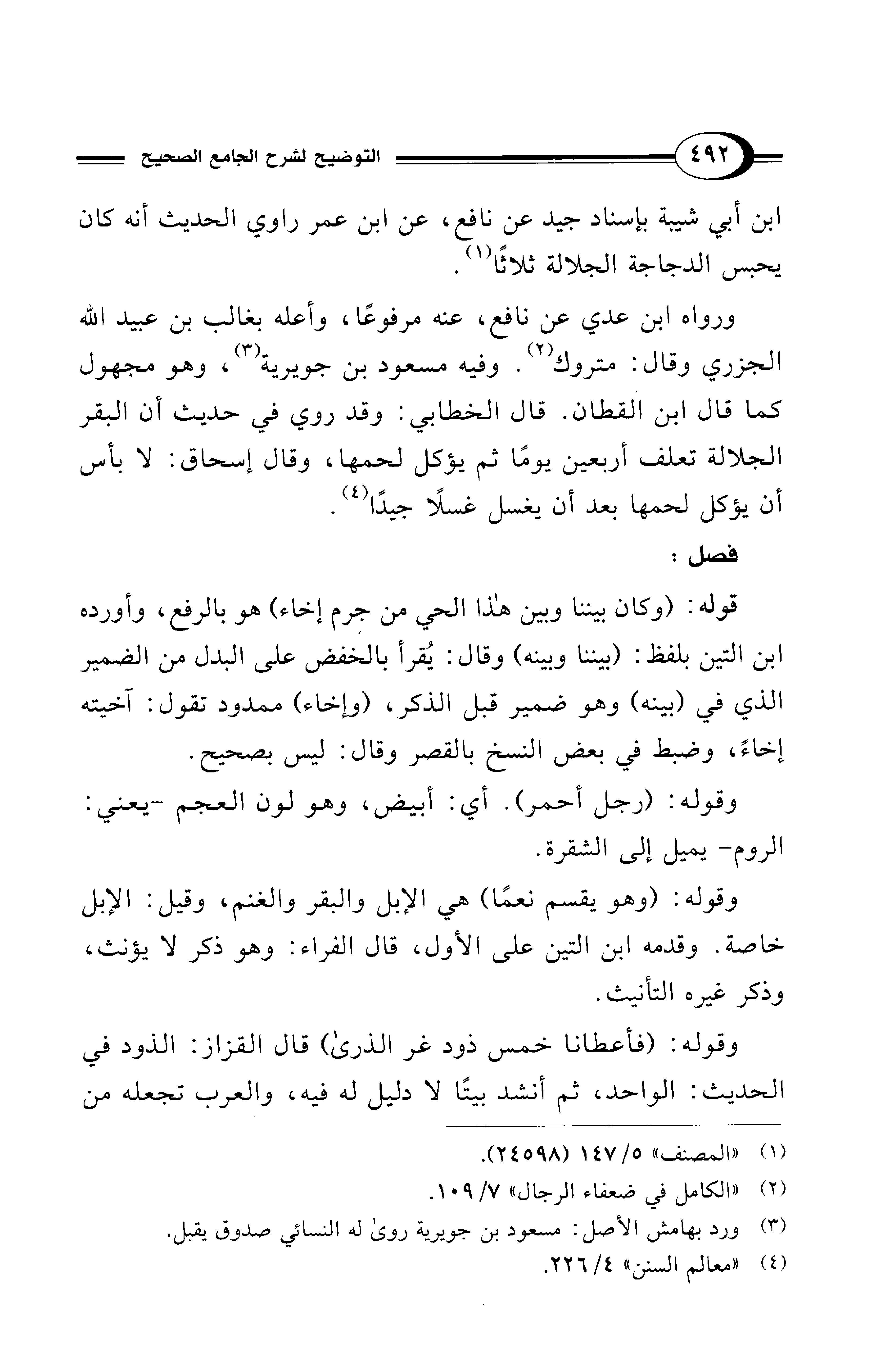 ورواه ابن عدي عن نافع، عنه مرفوعًا، وأعله بغالب بن عبيد الله الجزري وقال: متروك (¬2). وفيه مسعود بن جويرية (¬3)، وهو مجهول كما قال ابن القطان. قال الخطابي: وقد روي في حديث أن البقر الجلالة تعلف أربعين يومًا ثم يؤكل لحمها، وقال إسحاق: لا بأس أن يؤكل لحمها بعد أن يغسل غسلًا جيدًا (¬4).