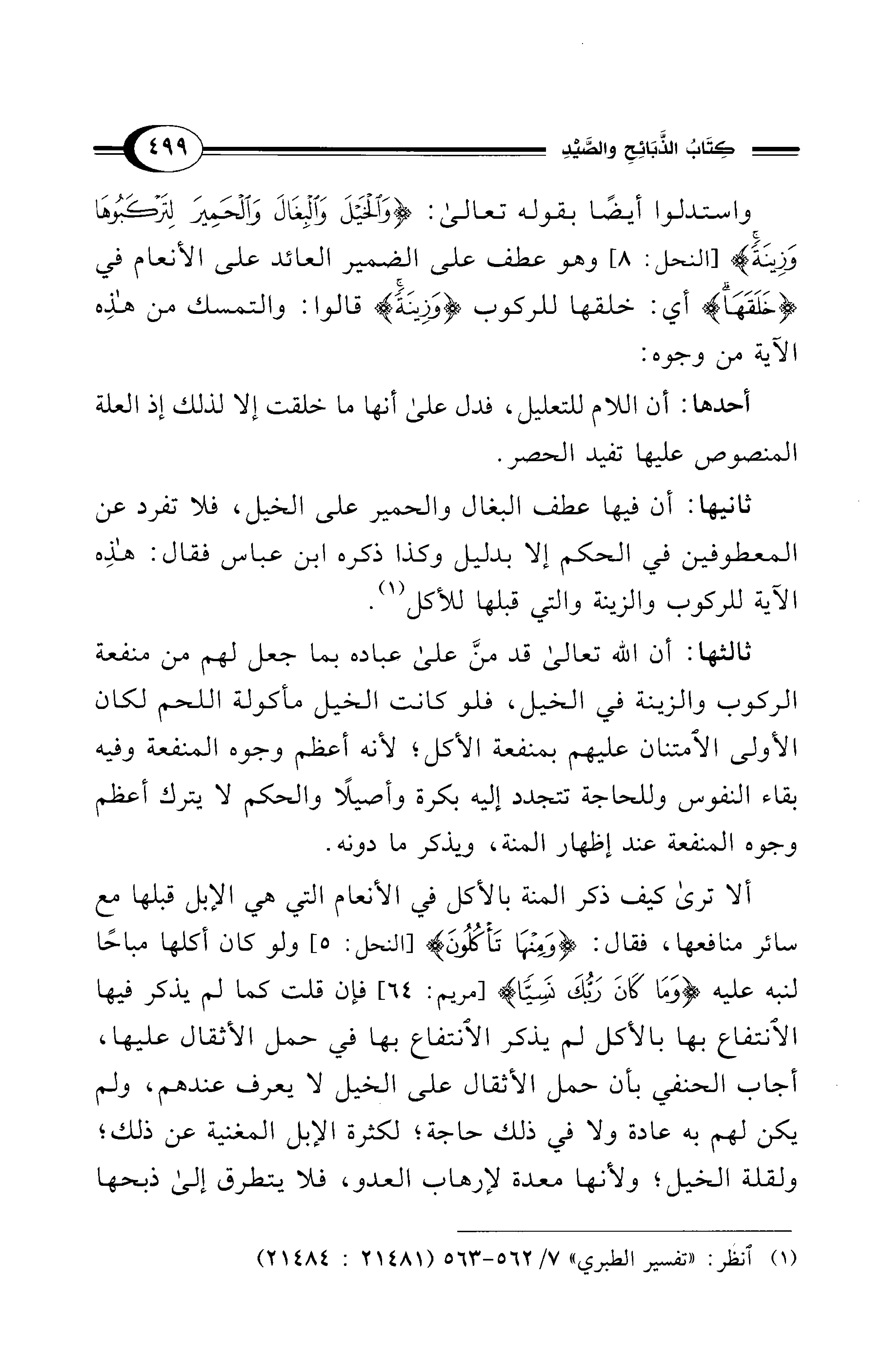 واستدلوا أيضًا بقوله تعالى: {وَالْخَيْلَ وَالْبِغَالَ وَالْحَمِيرَ لِتَرْكَبُوهَا وَزِينَةً} [النحل: 8] وهو عطف على الضمير العائد على الأنعام في في {خَلَقَهَا} أي: خلقها للركوب {وَزِينَةً} قالوا: والتمسك من هذِه الآية من وجوه: