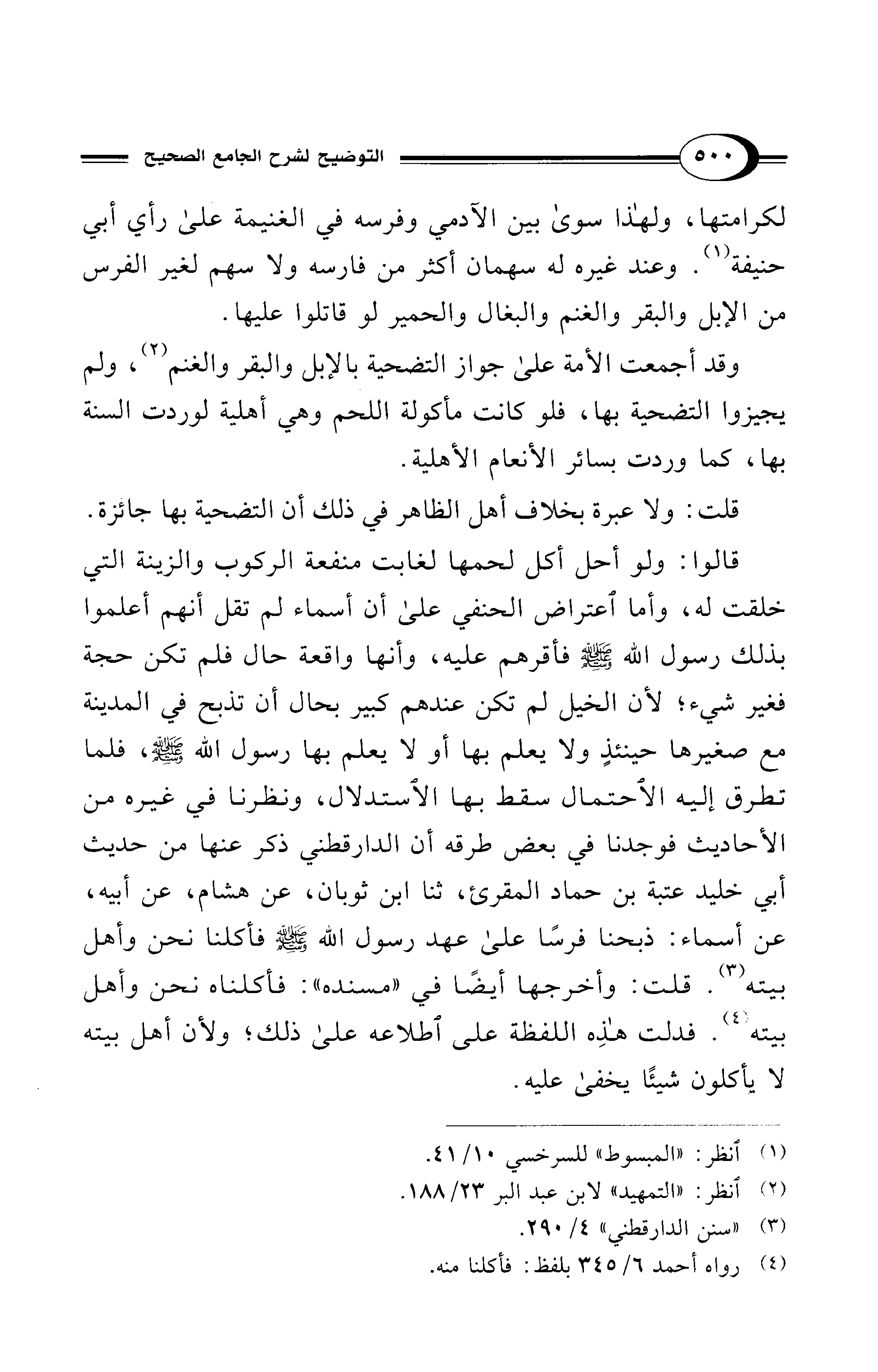 قالوا: ولو أحل أكل لحمها لغابت منفعة الركوب والزينة التي خلقت له، وأما اعتراض الحنفي على أن أسماء لم تقل أنهم أعلموا بذلك رسول الله - صلى الله عليه وسلم - فأقرهم عليه، وأنها واقعة حال فلم تكن حجة فغير شيء؛ لأن الخيل لم تكن عندهم كبير بحال أن تذبح في المدينة مع صغيرها حينئذٍ ولا يعلم بها أو لا يعلم بها رسول الله - صلى الله عليه وسلم -، فلما تطرق إليه الاحتمال سقط بها الاستدلال، ونظرنا في غيره من الأحاديث فوجدنا في بعض طرقه أن الدارقطني ذكر عنها من حديث