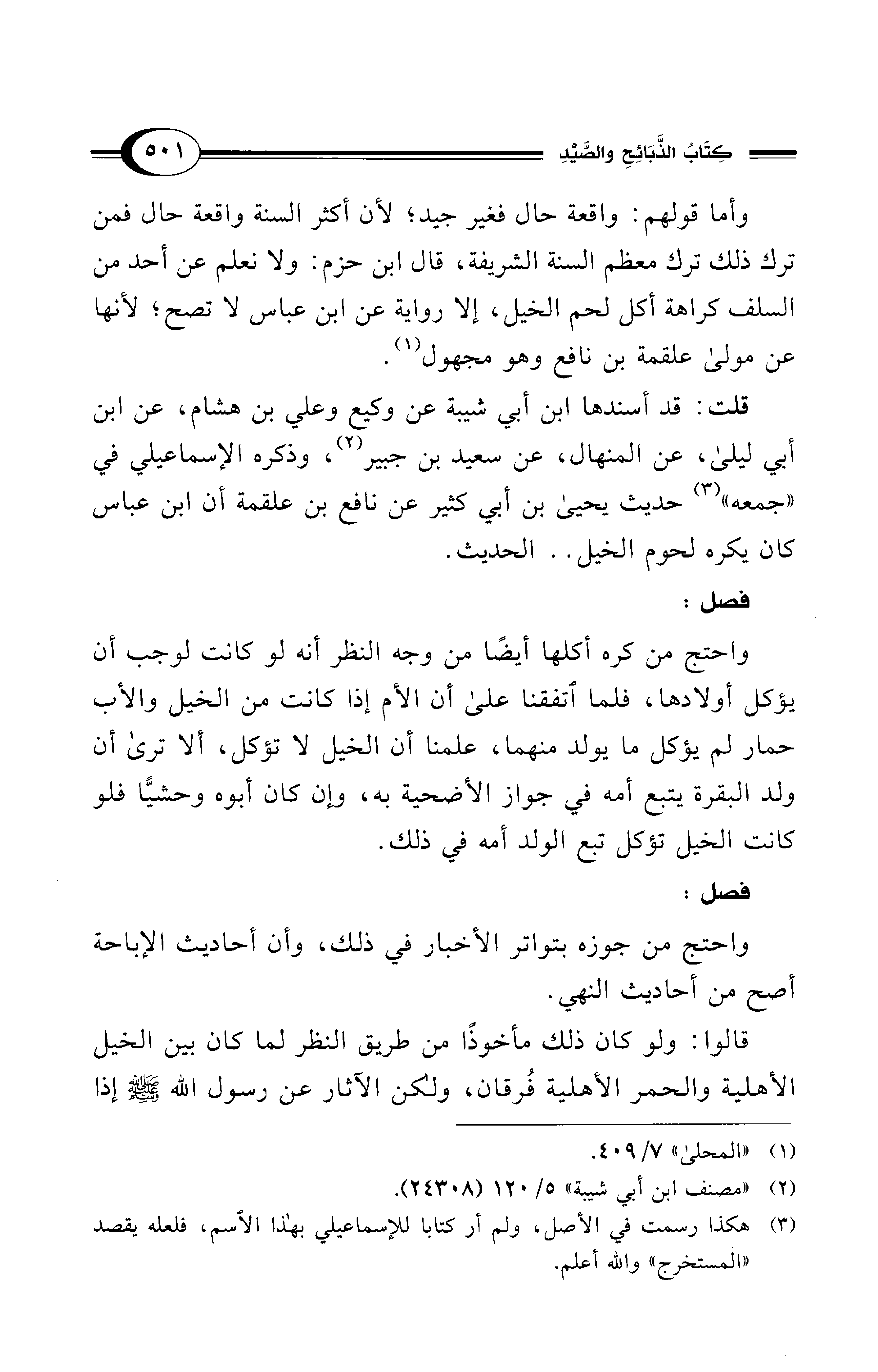 وأما قولهم: واقعة حال فغير جيد؛ لأن أكثر السنة واقعة حال فمن ترك ذلك ترك معظم السنة الشريفة، قال ابن حزم: ولا نعلم عن أحد من السلف كراهة أكل لحم الخيل، إلا رواية عن ابن عباس لا تصح؛ لأنها عن مولى علقمة بن نافع وهو مجهول (¬1).