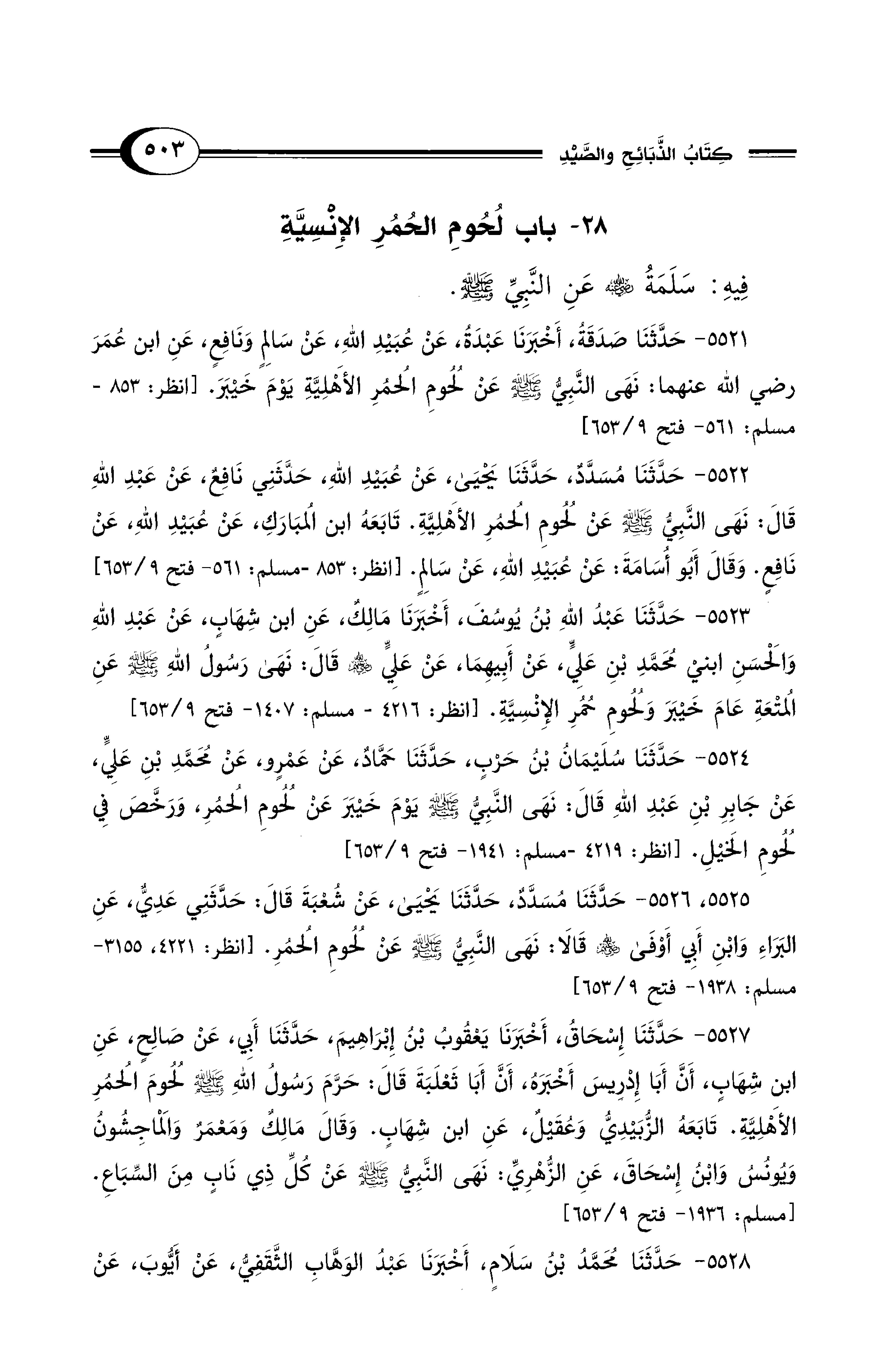 5525، 5526 - حَدَّثَنَا مُسَدَّدٌ، حَدَّثَنَا يَحْيَى، عَنْ شُعْبَةَ قَالَ: حَدَّثَنِي عَدِيٌّ، عَنِ الْبَرَاءِ وَابْنِ أَبِي أَوْفَى - رضي الله عنهم - قَالاَ: نَهَى النَّبِيُّ - صلى الله عليه وسلم - عَنْ لُحُومِ الْحُمُرِ. [انظر: 4221، 3155 - مسلم: 1938 - فتح 9/ 653]