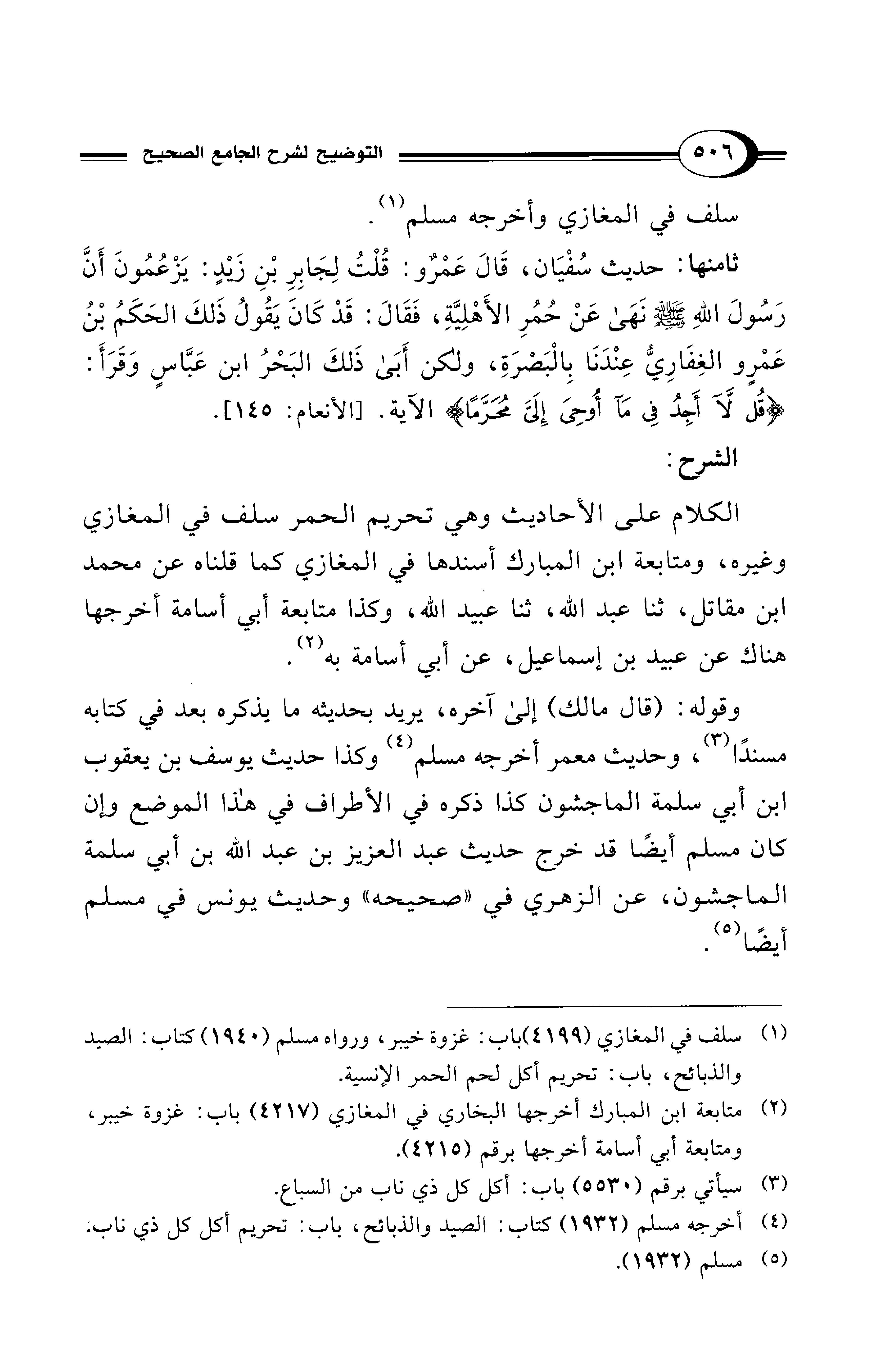 ثامنها: حديث سُفْيَان، قَالَ عَمْرٌو: قُلْتُ لِجَابِرِ بْنِ زَيْدٍ: يَزْعُمُونَ أَنَّ رَسُولَ اللهِ - صلى الله عليه وسلم - نَهَى عَنْ حُمُرِ الأَهْلِيَّةِ، فَقَالَ: قَدْ كَانَ يَقُولُ ذَلكَ الحَكَمُ بْنُ عَمْرٍو الغِفَارِيُّ عِنْدَنَا بِالْبَصْرَةِ، ولكن أَبَى ذَلكَ البَحْرُ ابن عَبَّاسٍ وَقَرَأَ: {قُلْ لَا أَجِدُ فِي مَا أُوحِيَ إِلَيَّ مُحَرَّمًا} الآية. [الأنعام: 145].