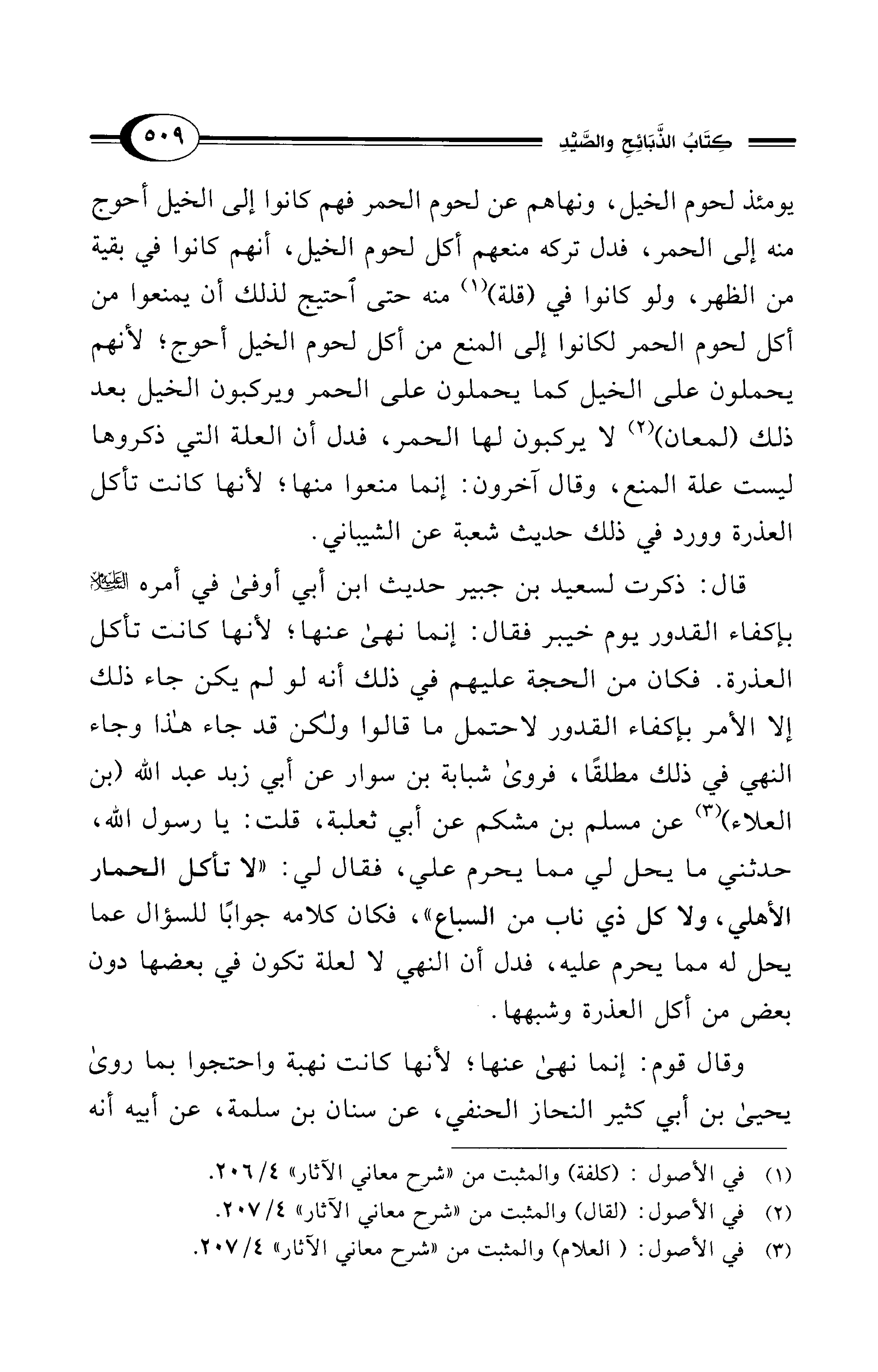 يومئذ لحوم الخيل، ونهاهم عن لحوم الحمر فهم كانوا إلى الخيل أحوج منه إلى الحمر، فدل تركه منعهم أكل لحوم الخيل، أنهم كانوا في بقية من الظهر، ولو كانوا في (قلة) (¬1) منه حتى احتيج لذلك أن يمنعوا من أكل لحوم الحمر لكانوا إلى المنع من أكل لحوم الخيل أحوج؛ لأنهم يحملون على الخيل كما يحملون على الحمر ويركبون الخيل بعد ذلك (لمعان) (¬2) لا يركبون لها الحمر، فدل أن العلة التي ذكروها ليست علة المنع، وقال آخرون: إنما منعوا منها؛ لأنها كانت تأكل العذرة وورد في ذلك حديث شعبة عن الشيباني.