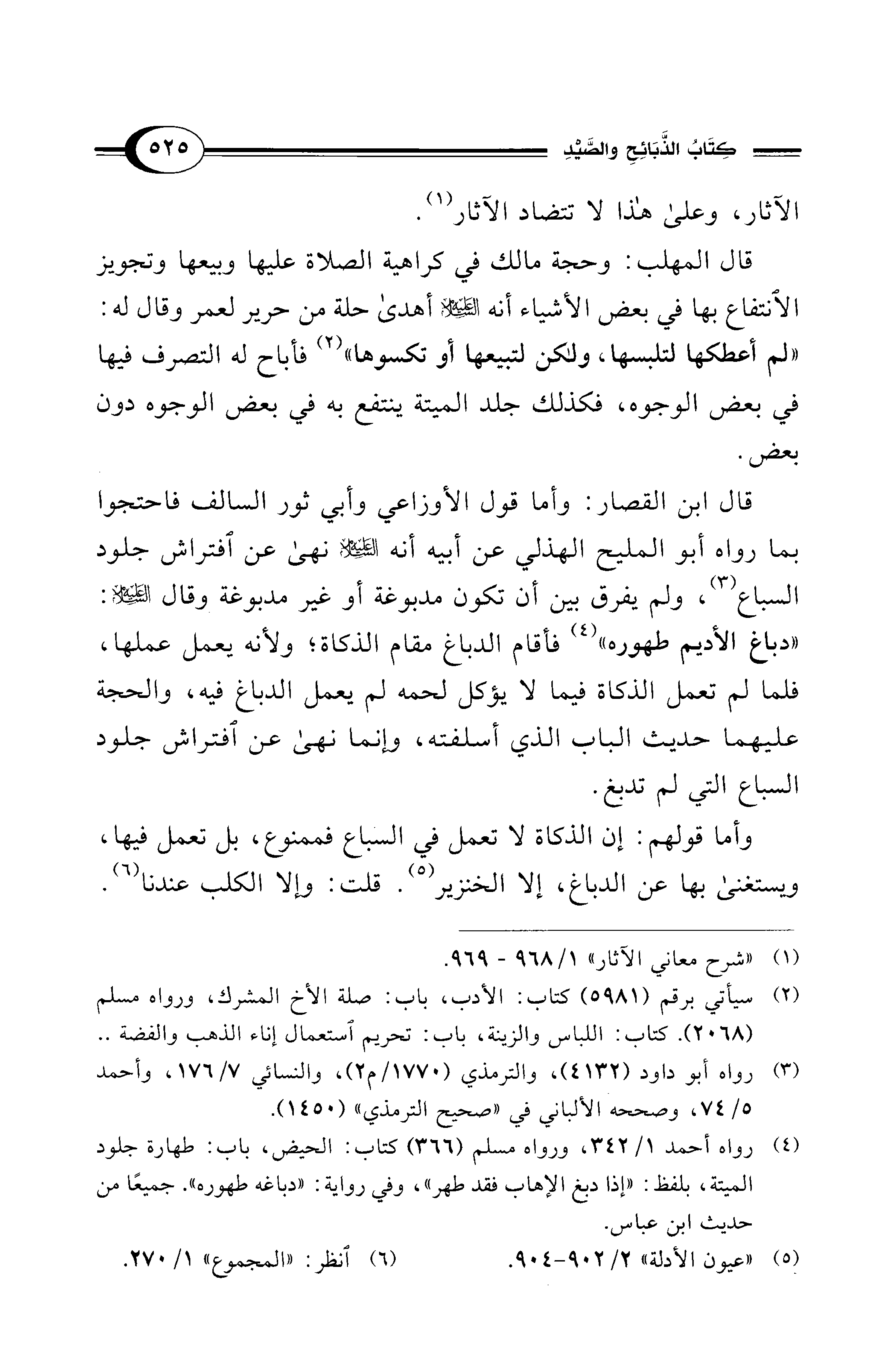 قال المهلب: وحجة مالك في كراهية الصلاة عليها وبيعها وتجويز الانتفاع بها في بعض الأشياء أنه - عليه السلام - أهدى حلة من حرير لعمر وقال له: "لم أعطكها لتلبسها، ولكن لتبيعها أو تكسوها" (¬2) فأباح له التصرف فيها في بعض الوجوه، فكذلك جلد الميتة ينتفع به في بعض الوجوه دون بعض.