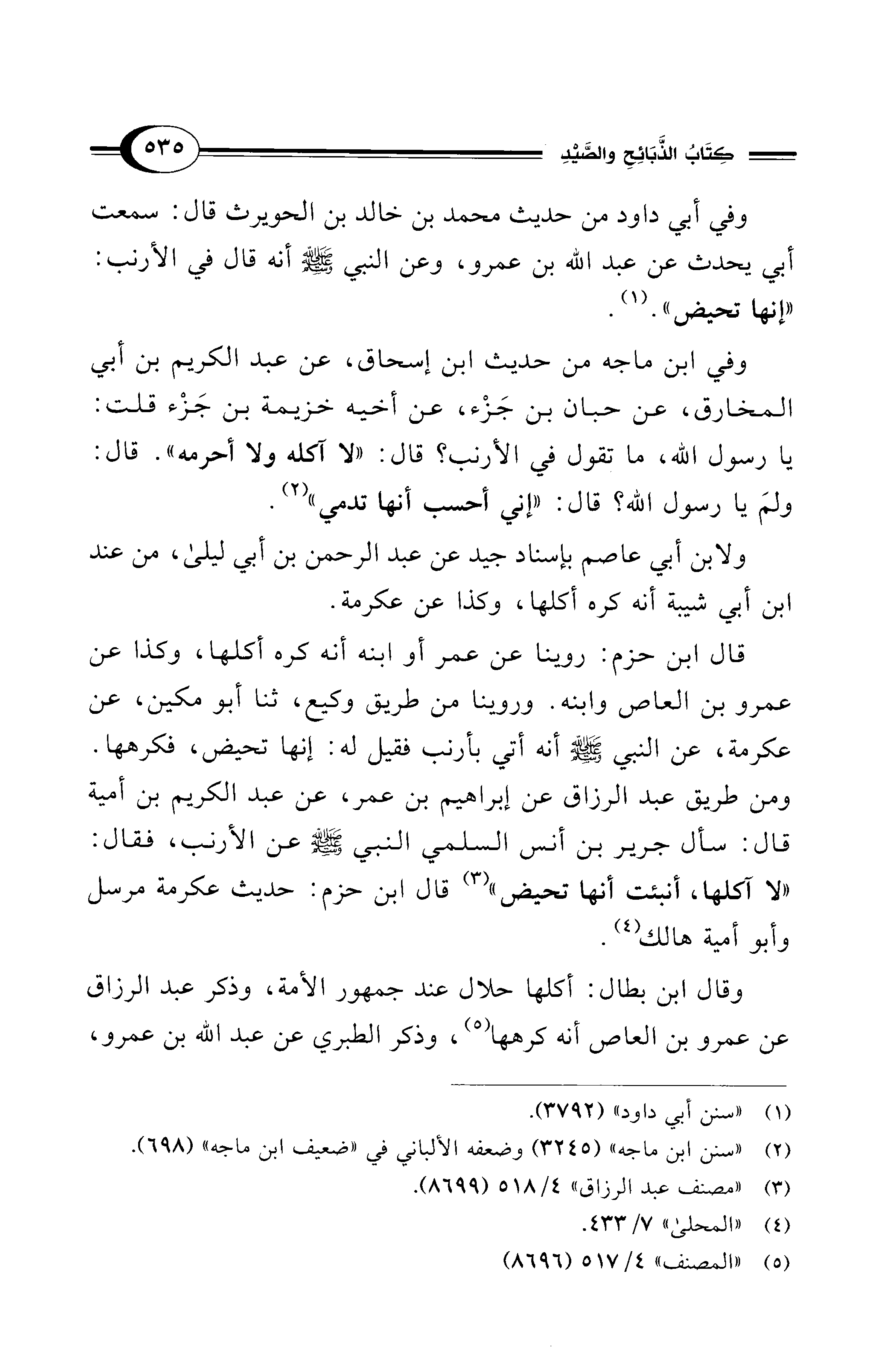 ومن طريق عبد الرزاق عن إبراهيم بن عمر، عن عبد الكريم بن أمية قال: سأل جرير بن أنس السلمي النبي - صلى الله عليه وسلم - عن الأرنب، فقال: "لا آكلها، أنبئت أنها تحيض" (¬3) قال ابن حزم: حديث عكرمة مرسل وأبو أمية هالك (¬4).