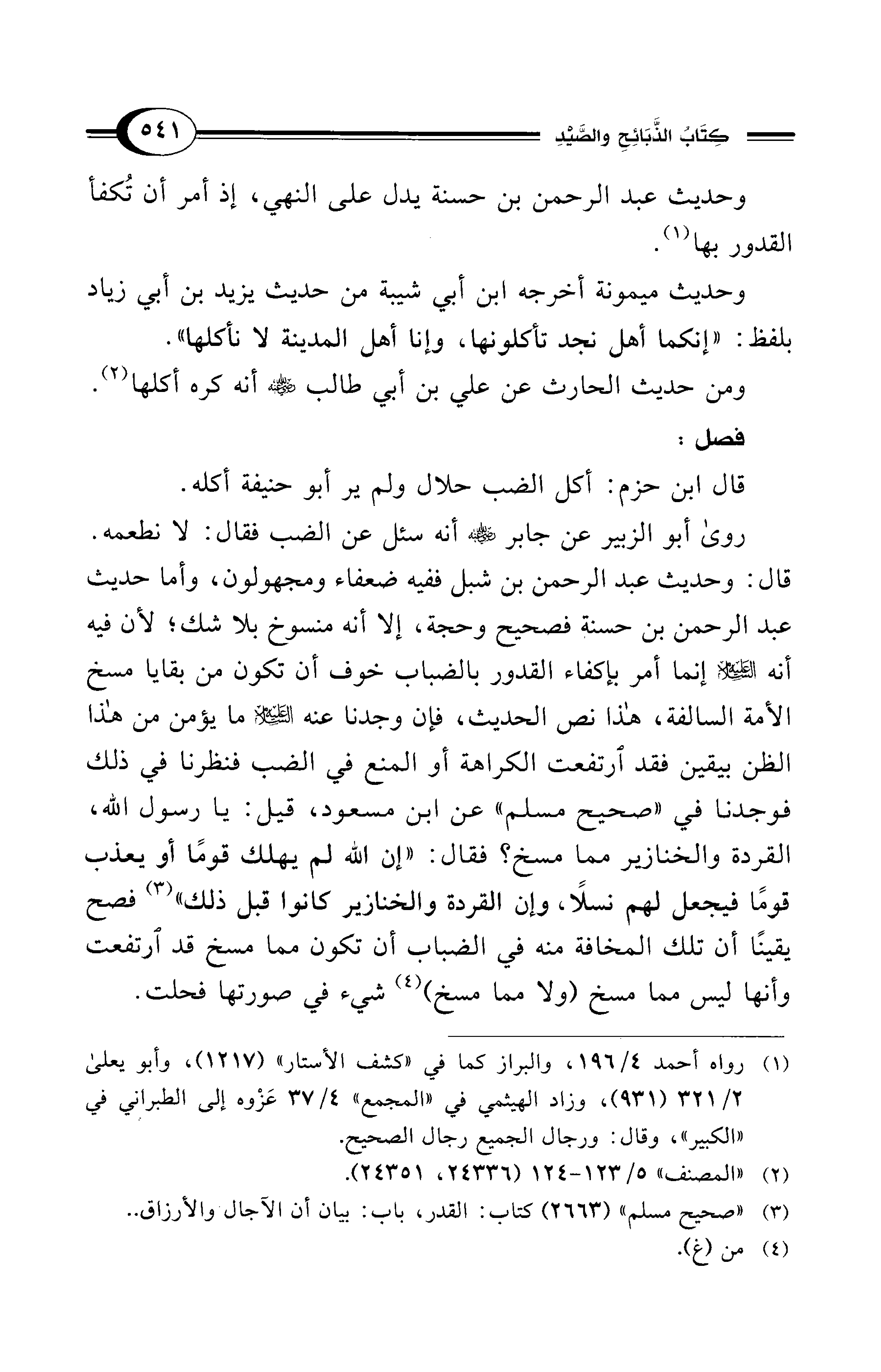 روى أبو الزبير عن جابر - رضي الله عنه - أنه سئل عن الضب فقال: لا نطعمه. قال: وحديث عبد الرحمن بن شبل ففيه ضعفاء ومجهولون، وأما حديث عبد الرحمن بن حسنة فصحيح وحجة، إلا أنه منسوخ بلا شك؛ لأن فيه أنه - عليه السلام - إنما أمر بإكفاء القدور بالضباب خوف أن تكون من بقايا مسخ الأمة السالفة، هذا نص الحديث، فإن وجدنا عنه - عليه السلام - ما يؤمن من هذا الظن بيقين فقد ارتفعت الكراهة أو المنع في الضب فنظرنا في ذلك فوجدنا في "صحيح مسلم" عن ابن مسعود، قيل: يا رسول الله، القردة والخنازير مما مسخ؟ فقال: "إن الله لم يهلك قومًا أو يعذب قومًا فيجعل لهم نسلاً، وإن القردة والخنازير كانوا قبل ذلك" (¬3) فصح يقينًا أن تلك المخافة منه في الضباب أن تكون مما مسخ قد ارتفعت وأنها ليس مما مسخ (ولا مما مسخ) (¬4) شيء في صورتها فحلت.