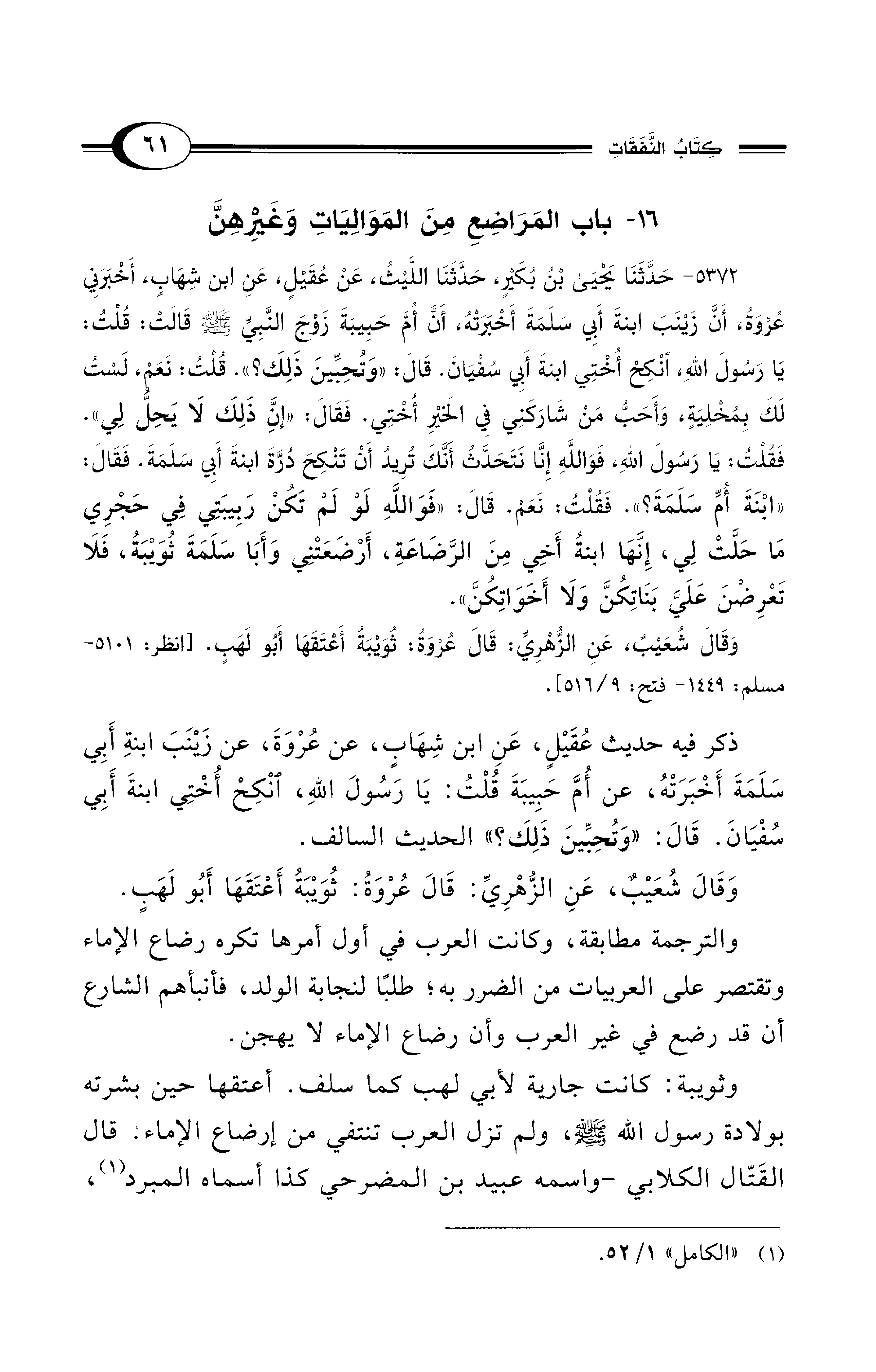 ذكر فيه حديث عُقَيْلٍ، عَنِ ابن شِهَابٍ، عن عُرْوَةَ، عن زينَبَ ابنةِ أَبِي سَلَمَةَ أَخْبَرَتْهُ، عن أُمَّ حَبِيبَةَ قُلْتُ: يَا رَسُولَ اللهِ، انْكِحْ أُخْتِي ابنةَ أَبِي سُفْيَانَ. قَالَ: "وَتُحِبِّينَ ذَلِكَ؟ " الحديث السالف.