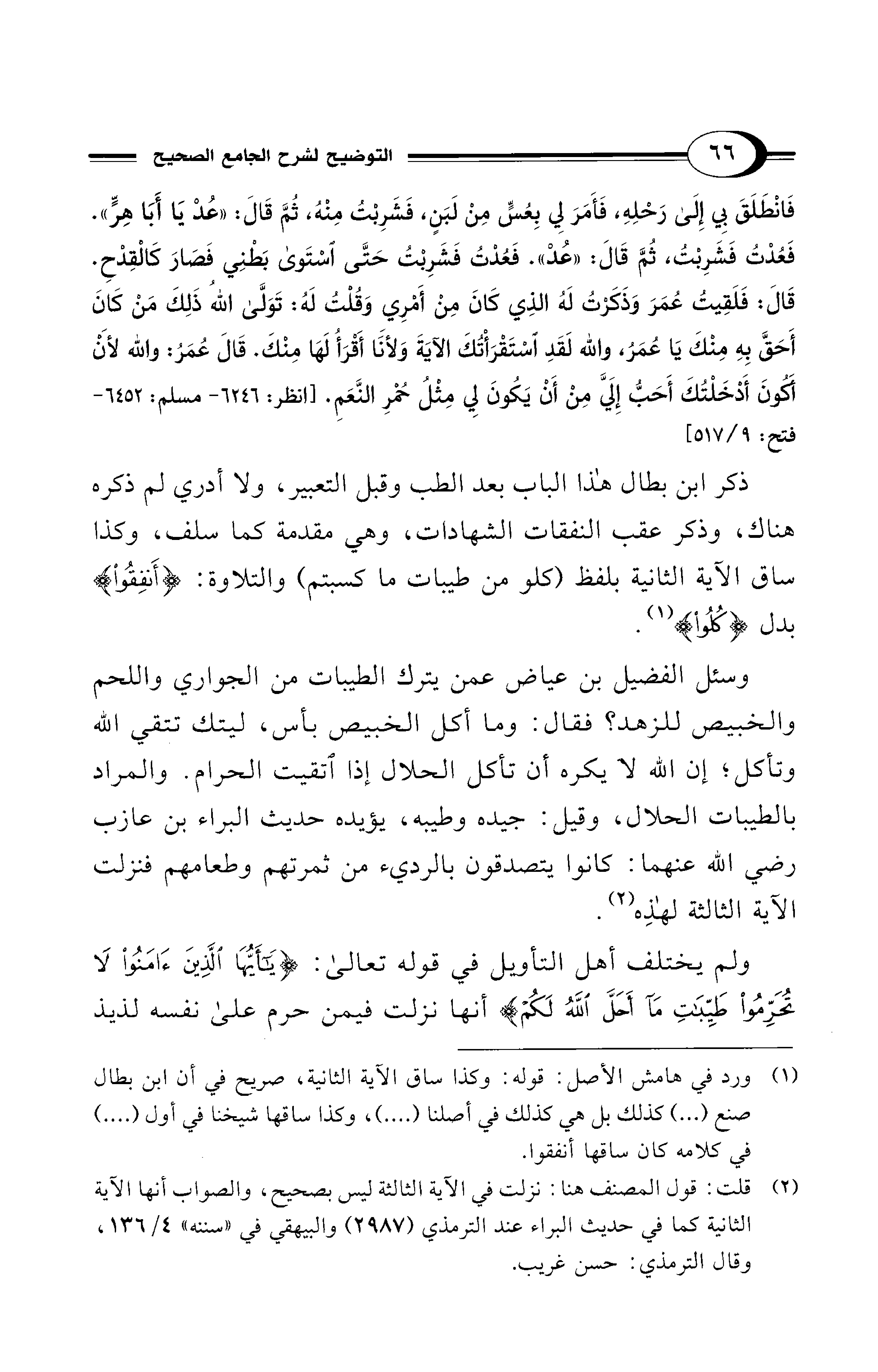 وسئل الفضيل بن عياض عمن يترك الطيبات من الجواري واللحم والخبيص للزهد؟ فقال: وما أكل الخبيص بأس، ليتك تتقي الله وتأكل؛ إن الله لا يكره أن تأكل الحلال إذا اتقيت الحرام. والمراد بالطيبات الحلال، وقيل: جيده وطيبه، يؤيده حديث البراء بن عازب - رضي الله عنهما -: كانوا يتصدقون بالرديء من ثمرتهم وطعامهم فنزلت الآية الثالثة لهذِه (¬2).