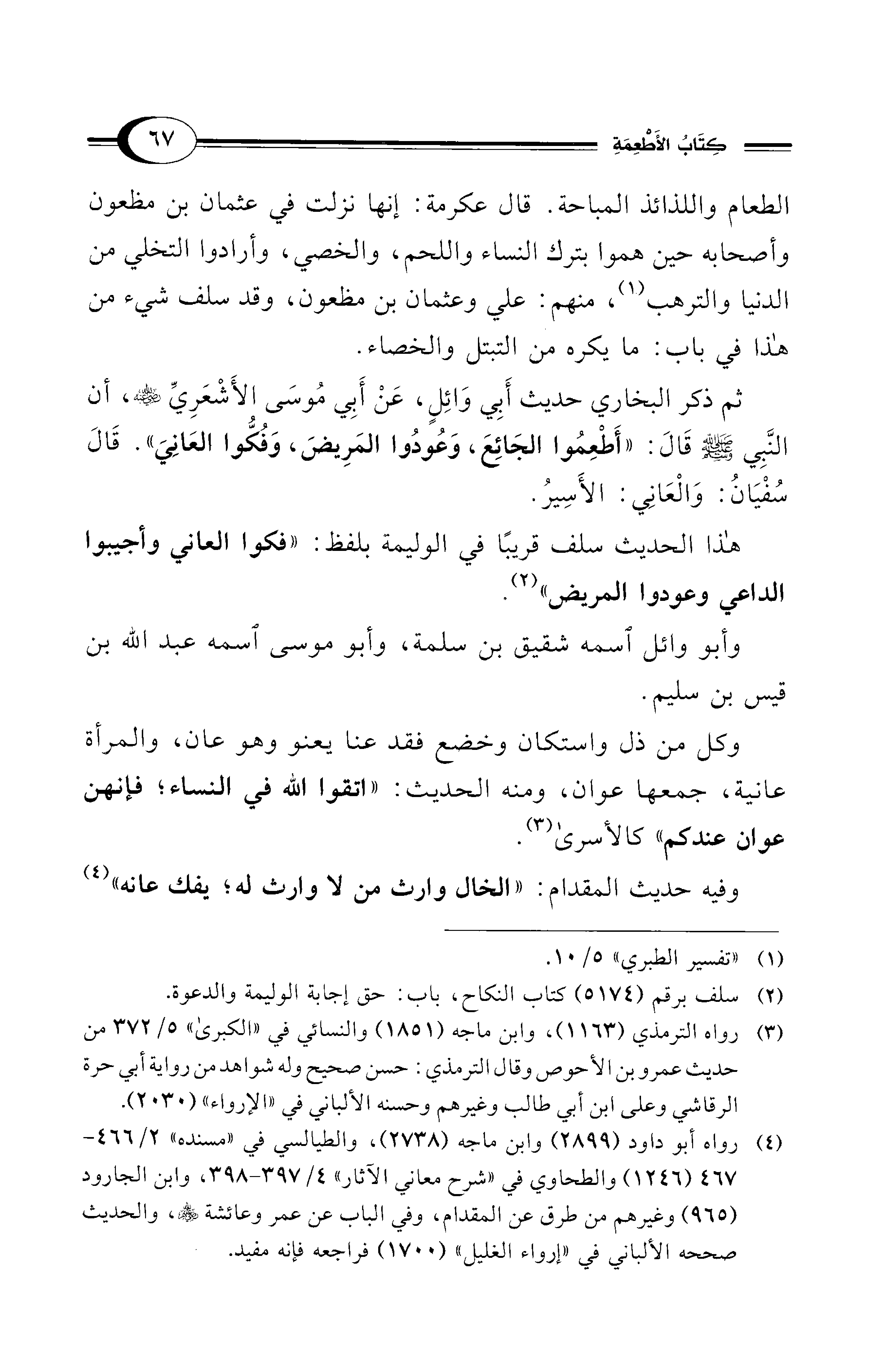 ثم ذكر البخاري حديث أَبِي وَائِلٍ، عَنْ أَبِي مُوسَى الأَشْعَرِيِّ - رضي الله عنه -، أن النَّبِي - صلى الله عليه وسلم - قَالَ: "أَطْعِمُوا الجَائِعَ، وَعُودُوا المَرِيضَ، وَفُكُّوا العَانِيَ". قَالَ سُفْيَانُ: وَالْعَانِي: الأَسِيرُ.