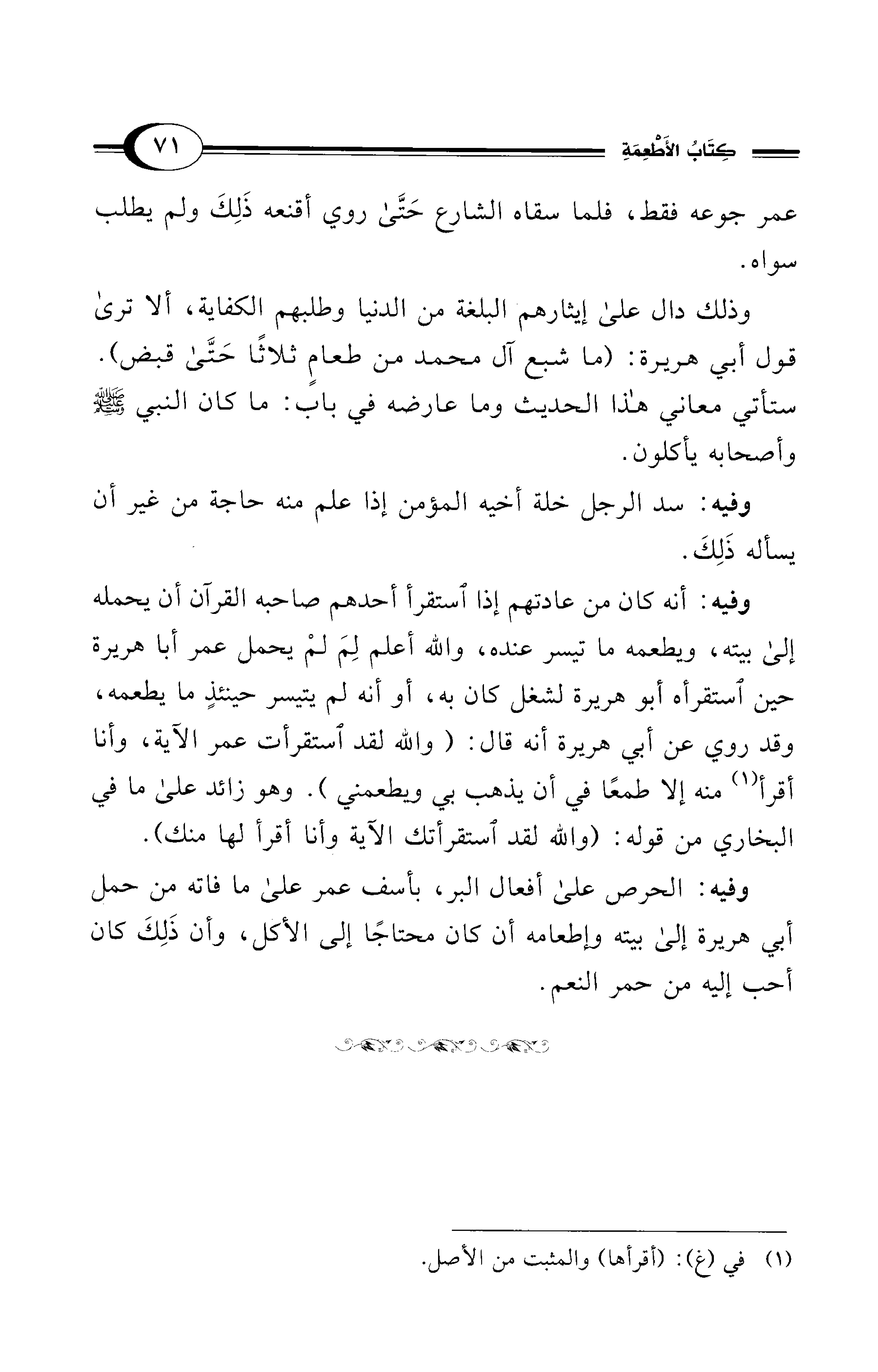 وذلك دال على إيثارهم البلغة من الدنيا وطلبهم الكفاية، ألا ترى قول أبي هريرة: (ما شبع آل محمد من طعامٍ ثلاثًا حَتَّى قبض). ستأتي معاني هذا الحديث وما عارضه في باب: ما كان النبي - صلى الله عليه وسلم - وأصحابه يأكلون.