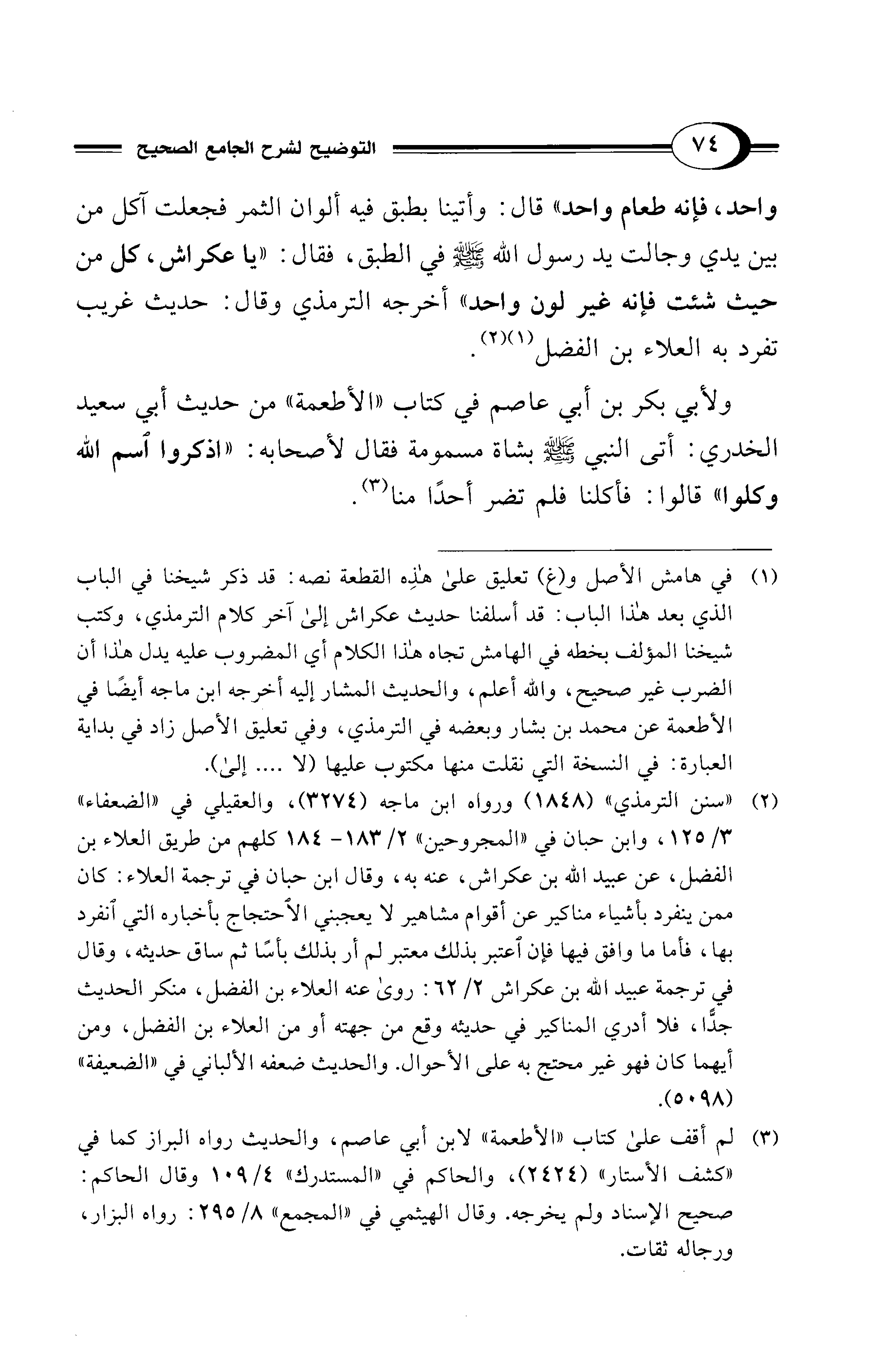 (¬1) في هامش الأصل و (غ) تعليق على هذِه القطعة نصه: قد ذكر شيخنا في الباب الذي بعد هذا الباب: قد أسلفنا حديث عكراش إلى آخر كلام الترمذي، وكتب شيخنا المؤلف بخطه في الهامش تجاه هذا الكلام أي المضروب عليه يدل هذا أن الضرب غير صحيح، والله أعلم، والحديث المشار إليه أخرجه ابن ماجه أيضًا في الأطعمة عن محمد بن بشار وبعضه في الترمذي، وفي تعليق الأصل زاد في بداية العبارة: في النسخة التي نقلت منها مكتوب عليها (لا .... إلى).