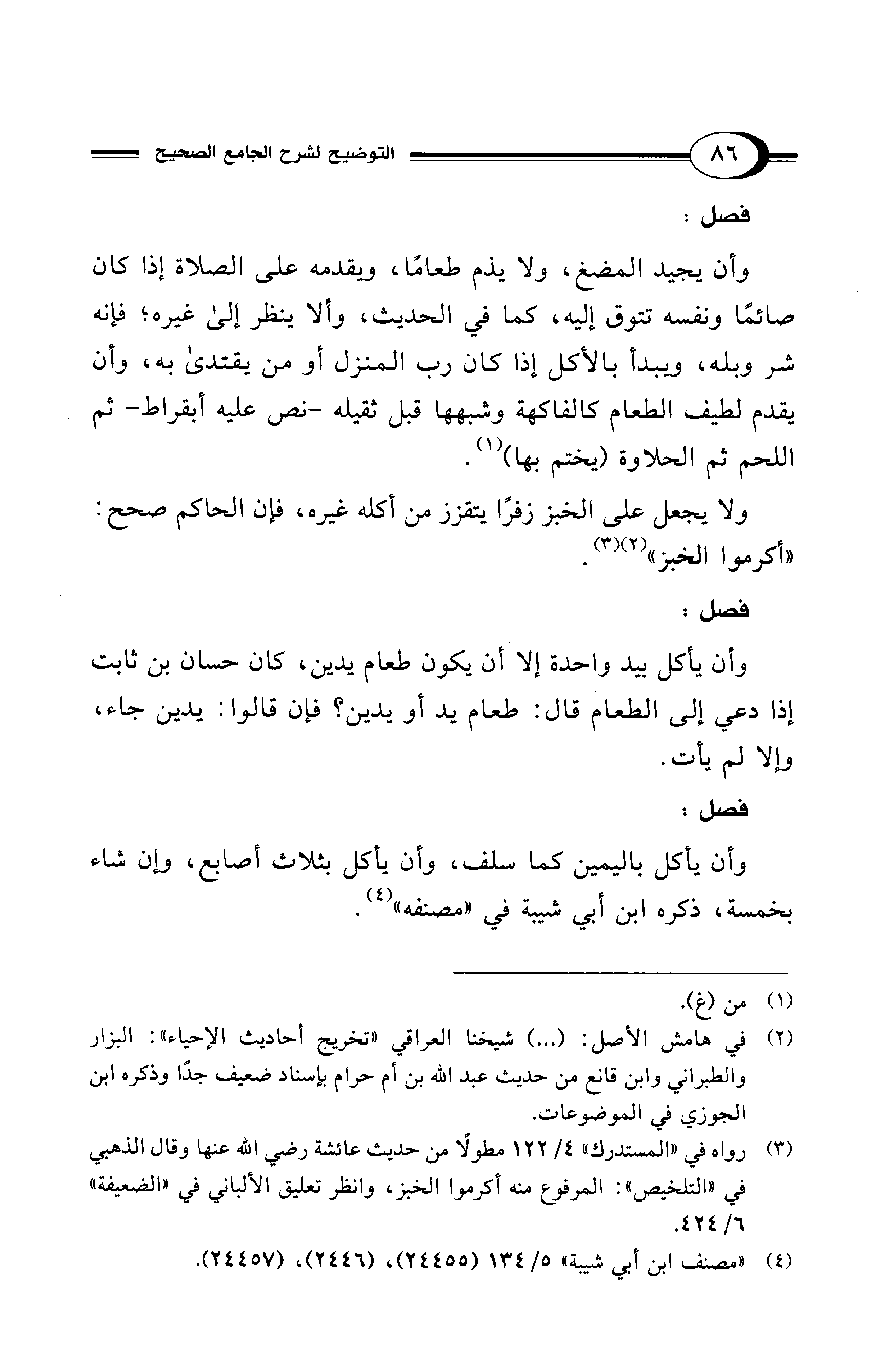 وأن يجيد المضغ، ولا يذم طعامًا، ويقدمه على الصلاة إذا كان صائمًا ونفسه تتوق إليه، كما في الحديث، وألا ينظر إلى غيره؛ فإنه شر وبله، ويبدأ بالأكل إذا كان رب المنزل أو من يقتدى به، وأن يقدم لطيف الطعام كالفاكهة وشبهها قبل ثقيله -نص عليه أبقراط- ثم اللحم ثم الحلاوة (يختم بها) (¬1).