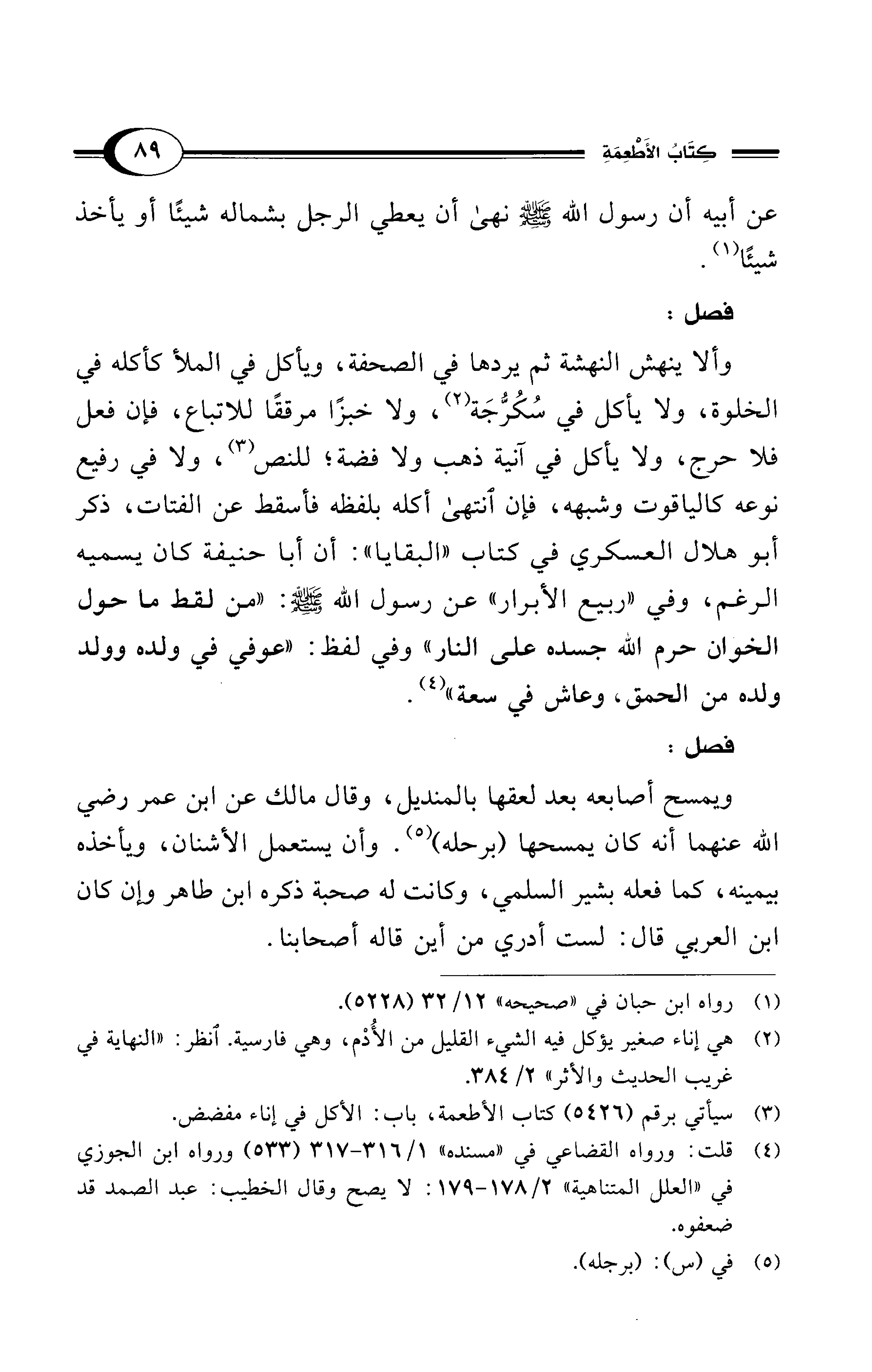 وألا ينهش النهشة ثم يردها في الصحفة، ويأكل في الملأ كأكله في الخلوة، ولا يأكل في سُكُرُّجَة (¬2)، ولا خبزًا مرققًا للاتباع، فإن فعل فلا حرج، ولا يأكل في آنية ذهب ولا فضة؛ للنص (¬3)، ولا في رفيع نوعه كالياقوت وشبهه، فإن انتهى أكله بلفظه فأسقط عن الفتات، ذكر أبو هلال العسكري في كتاب "البقايا": أن أبا حنيفة كان يسميه الرغم، وفي "ربيع الأبرار" عن رسول الله - صلى الله عليه وسلم -: "من لقط ما حول الخوان حرم الله جسده على النار" وفي لفظ: "عوفي في ولده وولد ولده من الحمق، وعاش في سعة" (¬4).