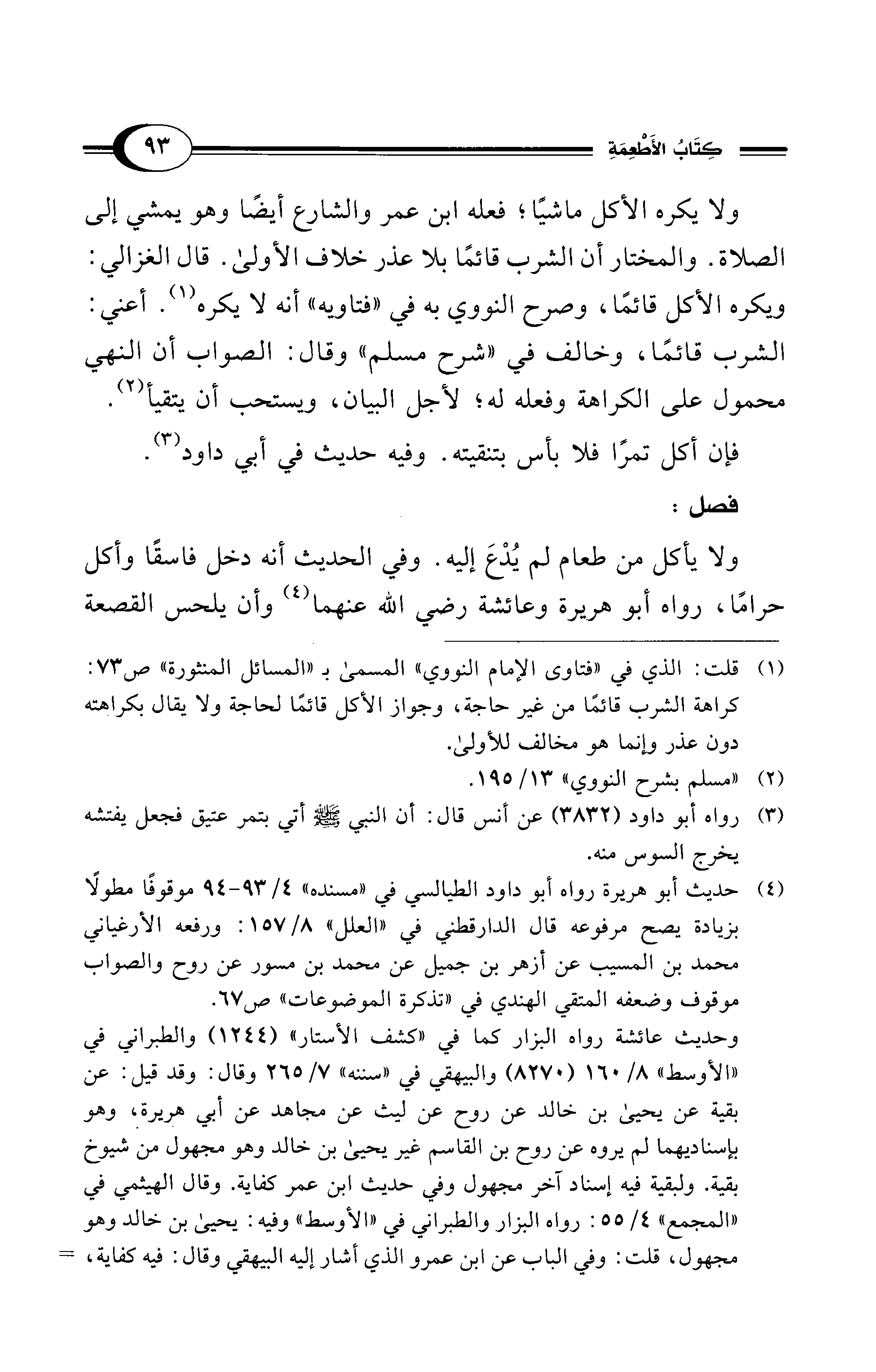 (¬1) قلت: الذي في "فتاوى الإِمام النووي" المسمى بـ "المسائل المنثورة" ص 73: كراهة الشرب قائمًا من غير حاجة، وجواز الأكل قائمًا لحاجة ولا يقال بكراهته دون عذر وإنما هو مخالف للأولى.