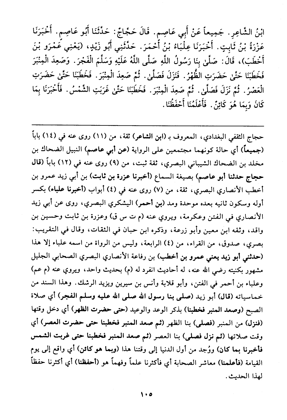 ابنُ الشَّاعِرِ. جَمِيعًا عَنْ أَبِي عَاصِمٍ. قَال حَجَّاجٌ: حَدَّثَنَا أَبُو عَاصِمٍ. أَخبَرَنَا عَزْرَةُ بن ثَابِتٍ. أَخبَرَنَا عِلبَاءُ بن أَحمَرَ. حَدثَنِي أَبُو زَيدٍ، (يَعْنِي عَمرَو بنَ أَخْطَبَ)، قَال: صَلَّى بِنَا رَسُولُ اللهِ صَلى اللهُ عَلَيهِ وَسَلمَ الفَجْرَ. وَصَعِدَ الْمِنبَرَ فَخَطَبَنَا حَتَّى حَضَرَتِ الظُّهْرُ. فَنَزَلَ فَصَلى. ثُم صَعِدَ المِنبَرَ. فَخَطَبَنَا حَتى حَضَرَتِ العَصرُ. ثُمَّ نَزَلَ فَصَلى. ثُم صَعِدَ المِنبَرَ. فَخَطَبَنَا حَتى غَرَبَتِ الشمْسُ. فَأخبَرَنَا بِمَا كَانَ وَبِمَا هُوَ كَائِنٌ. فَأعلَمُنَا أَحفَظُنَا