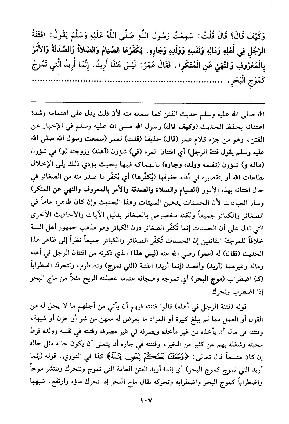 وَكَيفَ قَال؟ قَال قُلْتُ: سَمِعتُ رَسُولَ اللهِ صَلَّى اللهُ عَلَيهِ وَسَلَّمَ يَقُولُ: "فِتنَةُ الرجُلِ فِي أَهْلِهِ وَمَالِهِ وَنَفْسِهِ وَوَلَدِهِ وَجَارِهِ. يُكَفِّرُهَا الصيَامُ وَالصلاة وَالصدَقَةُ وَالأَمرُ بِالمَعْرُوفِ وَالنهي عَنِ المُنكَرِ. فَقَال عُمَرُ: لَيسَ هَذَا أُرِيدُ. إِنَّمَا أُرِيدُ التِي تَمُوجُ كَمَوْجِ الْبَحرِ