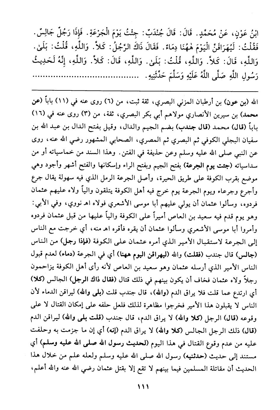 ابْنُ عَوْنٍ، عَنْ مُحَمدٍ. قَال: قَال جُنْدَبٌ: جِئْتُ يَوْمَ الْجَرْعَةِ. فَإذَا رَجُلٌ جَالِسٌ. فَقُلْتُ: لَيُهَرَاقَنَّ الْيَوْمَ ههُنَا دِمَاءٌ. فَقَال ذَاكَ الرَّجُلُ: كَلا. وَاللهِ، قُلتُ: بَلَى. وَاللهِ، قَال: كَلا. وَاللهِ، قُلْتُ: بَلَى. وَاللهِ، قَال: كَلا. وَاللهِ، إِنهُ لَحَدِيثُ رَسُولِ اللهِ صَلى اللهُ عَلَيهِ وَسَلمَ حَدَّثَنِيهِ