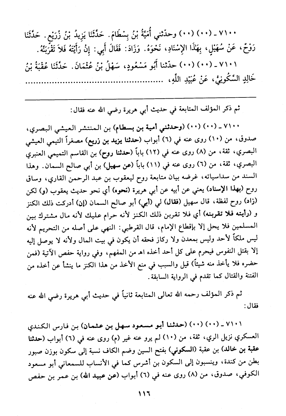 ٧١٠٠ - (٠٠) (٠٠) (وحدثني أمية بن بسطام) بن المنتشر العيشي البصري، صدوق، من (١٠) روى عنه في (٦) أبواب (حدثنا يزيد بن زريع) مصغرا التيمي العيشي البصري، ثقة، من (٨) روى عنه في (١٢) بابا (حدثنا روح) بن القاسم التميمي العنبري البصري، ثقة، من (٦) روى عنه في (١١) بابا (عن سهيل) بن أبي صالح السمان. وهذا السند من سداسياته، غرضه بيان متابعة روح ليعقوب بن عبد الرحمن القاري، وساق روح (بهذا الإسناد) يعني عن أبيه عن أبي هريرة (نحوه) أي نحو حديث يعقوب (و) لكن (زاد) روح لفظة، قال سهيل (فقال) لي (أبي) أبو صالح السمان (أن) أدركت ذلك الكنز و (رأيته فلا تقربنه) أي فلا تقربن ذلك الكنز لأنه حرام عليك لأنه مال مشترك بين المسلمين فلا يحل إلا بإقطاع الإمام، قال القرطبي: النهي على أصله من التحريم لأنه ليس ملكا لأحد وليس بمعدن ولا ركاز فحقه أن يكون في بيت المال ولأنه لا يوصل إليه إلا بقتل النفوس فيحرم على كل أحد أخذه اهـ من المفهم، وفي رواية حفص الآتية (فمن حضره فلا يأخذ منه شيئًا) قيل والسبب في منع الأخذ من هذا الكنز ما ينشأ عن أخذه من الفتنة والقتال كما تقدم في الرواية السابقة.