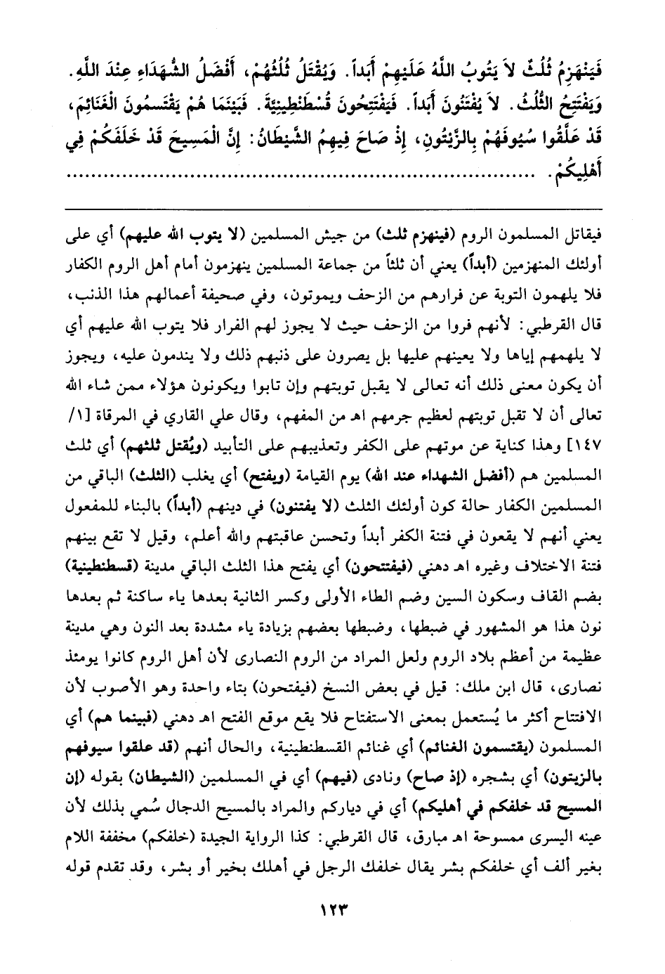 فَيَنْهَزِمُ ثُلُثٌ لَا يَتُوبُ اللهُ عَلَيهِمْ أَبدًا. وَيُقْتَلُ ثُلُثُهُمْ، أَفْضَلُ الشهَدَاءِ عِنْدَ اللهِ. وَيَفْتَتِحُ الثلُثُ. لَا يُفتنُونَ أَبدًا. فَيَفْتَتِحُونَ قُسْطَنْطِينِيَّةَ. فَبَينَمَا هُمْ يَقتَسمُونَ الْغَنَائِمَ، قَد عَلَّقُوا سُيُوفَهُمْ بِالزَّيتُونِ، إذْ صَاحَ فِيهِمُ الشيطَانُ: إنَّ الْمَسِيحَ قَدْ خَلَفَكُمْ فِي أَهْلِيكُمْ