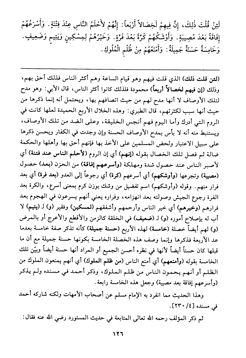 لَئِنْ قُلتَ ذلِكَ، إِن فِيهِمْ لَخِصَالًا أَربَعًا: إِنَّهُم لأَحْلَمُ الناسِ عِندَ فِتنَةٍ. وَأَسْرَعُهُمْ إِفَاقَةً بَعدَ مُصِيبَةٍ. وَأَوْشَكُهُمْ كَرَّةً بَعْدَ فَرَّةٍ. وَخَيْرُهُمْ لِمسكِينٍ ويتِيمٍ وَضَعِيفٍ. وَخَامِسَةٌ حَسَنَةٌ جَمِيلَةٌ: وَأَمْنَعُهُمْ مِنْ ظُلْمِ الْمُلُوكِ