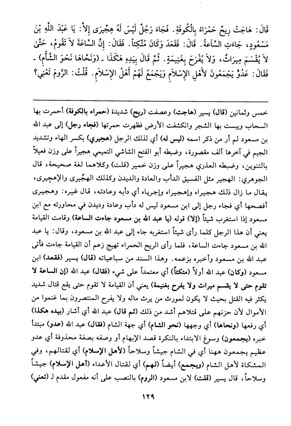 خمس وثمانين (قال) يسير (هاجت) وعصفت (ريح) شديدة (حمراء بالكوفة) أحمرت بها السحاب ويبست بها الشجر وانكشفت الأرض فظهرت حمرتها (فجاء رجل) إلى عبد الله بن مسعود لم أر من ذكر اسمه (ليس له) أي لذلك الرجل (هجيري) بكسر الهاء وتشديد الجيم في آخرها ألف مقصورة، وضبطه أبو الفتح الشاشي التميمي هجيرًا على وزن فعيلًا بالتنوين، وضبطه العذري هجيرًا على وزن خمير (قلت) وكلاهما لغة صحيحة، قال الجوهري: الهجير مثل الفسيق الدأب والعادة والديدن وكذلك الهجِّيرى والإهجِيرى، يقال ما زال ذلك هجيراه وإهجيراه وإجرياه أي دأبه وعادته، قال غيره: وهجيرى أفصحها أي فجاء رجل إلى ابن مسعود ليس له دأب وعادة وديدن في محاورته مع ابن مسعود إذا استغرب شيئًا (إلا) قوله (يا عبد الله بن مسعود جاءت الساعة) وقامت القيامة يعني أن هذا الرجل كلما رأى شيئًا استغربه جاء إلى عبد الله بن مسعود، وقال: يا عبد الله بن مسعود جاءت الساعة، فلما رأى الريح الحمراء تهيج زعم أن القيامة جاءت فأتى عبد الله بن مسعود وأخبره بزعمه. وهذا السند من سباعياته (قال) يسير (فقعد) ابن مسعود (وكان) عبد الله أولًا (متكئًا) أي معتمدًا على شيء (فقال) عبد الله (إن الساعة لا تقوم حتى لا يقسم ميراث ولا يفرح بغنيمة) يعني أن القيامة لا تقوم حتى يقع قتال شديد يكثر فيه القتل بحيث لا يكون لمورث من يرث ماله ولا يفرح المنتصرون بما غنموا من الأموال لأن حزنهم على قتلاهم أشد من ذلك (ثم قال) عبد الله أي أشار (بيده هكذا) أي رفعها (ونحاهما) أي وجهها (نحو الشام) أي جهة الشام (فقال) عبد الله (عدو) مبتدأ خبره (يجمعون) وسوغ الابتداء بالنكرة قصد الإبهام أو وصفه بصفة محذوفة أي عدو عظيم يجمعون ها هنا أي في الشام جيشًا وسلاحًا (لأهل الإسلام) أي لقتالهم، وفي المشكاة لأهل الشام (ويجمع) أيضًا (لهم) أي لقتال الأعداء (أهل الإسلام) جيشًا وسلاحًا، قال يسير (قلت) لابن مسعود (الروم) بالنصب على أنه مفعول مقدم لـ (تعني)