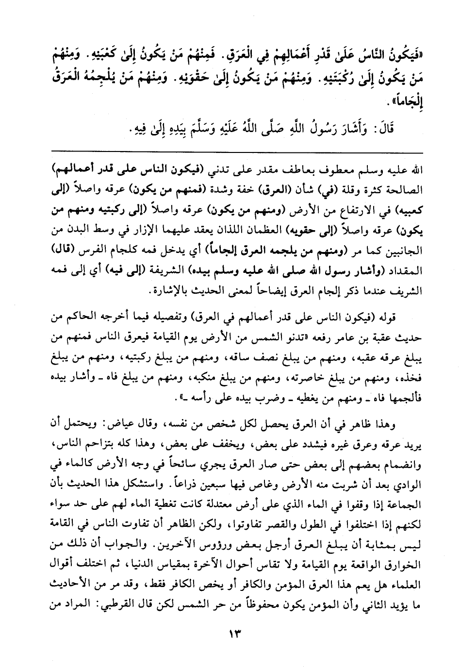 "فَيَكُونُ الناسُ عَلَى قَدْرِ أَعْمَالِهِمْ فِي الْعَرَقِ. فَمِنْهُمْ مَنْ يَكُونُ إِلَى كَعبَيهِ. وَمِنْهُمْ مَنْ يَكُونُ إِلَى رُكبَتَيهِ. وَمِنْهُمْ مَنْ يَكُونُ إِلَى حَقْوَيهِ. وَمِنهُم مَنْ يُلْجِمُهُ الْعَرَقُ إِلْجَامًا".