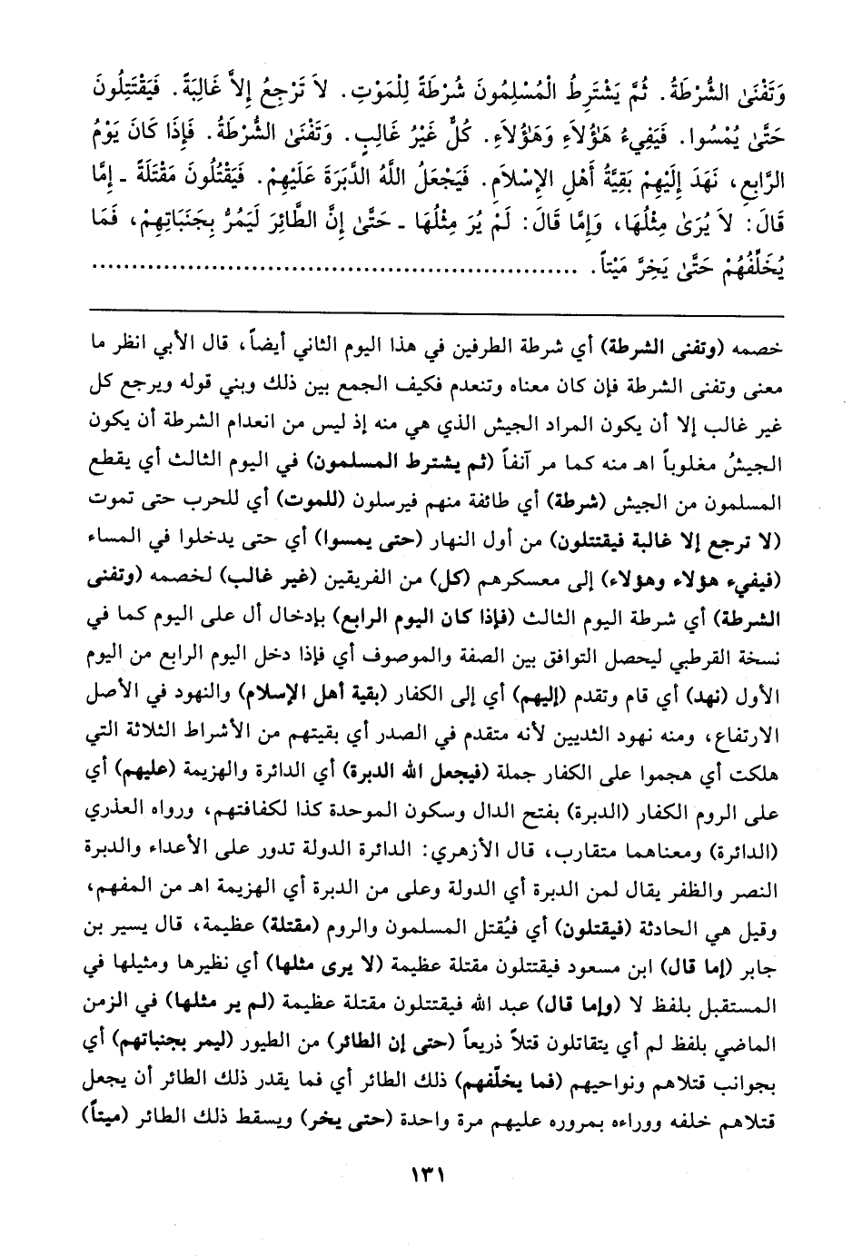 وَتَفْنَى الشُّرْطَةُ. ثُمَّ يَشْتَرِطُ المسلِمُونَ شُرطَةً لِلمَوتِ. لَا تَرْجِعُ إلا غَالِبَةً. فَيَقتَتِلُونَ حَتَّى يُمْسُوا. فَيَفِيءُ هؤُلاءِ وَهؤُلاءِ. كُلٌّ غَيرُ غَالِبٍ. وَتَفْنَى الشُّرْطَةُ. فَإِذَا كَانَ يَومُ الرَّابع، نَهَدَ إِلَيهِم بَقِيَّةُ أهلِ الإِسلامِ. فَيَجْعَلُ اللهُ الدَّبَرَةَ عَلَيهِمْ. فَيَقْتُلُونَ مَقتَلَةً -إِمَّا قَال: لَا يُرَى مِثلُهَا، أمَّا قَال: لَم يُرَ مِثلُهَا- حَتَّى إِنَّ الطَّائِرَ لَيَمُرُّ بِجَنَبَاتِهِم، فَمَا يُخَلِّفُهُم حَتَّى يَخِرَّ مَيْتًا