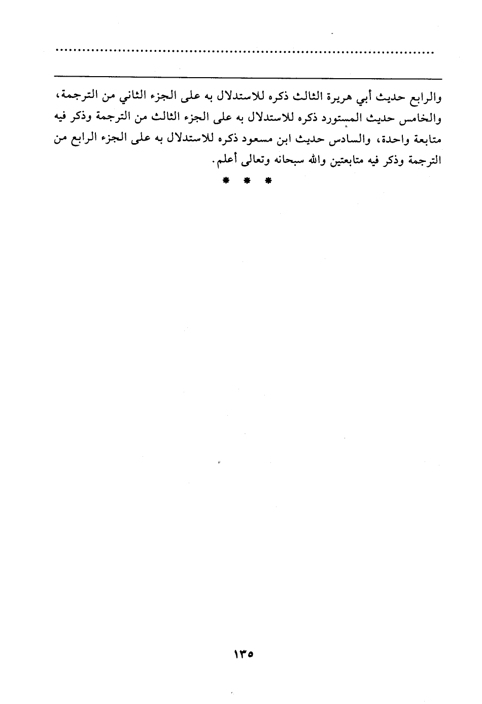 والرابع حديث أبي هريرة الثالث ذكره للاستدلال به على الجزء الثاني من الترجمة، والخامس حديث المستورد ذكره للاستدلال به على الجزء الثالث من الترجمة وذكر فيه متابعة واحدة، والسادس حديث ابن مسعود ذكره للاستدلال به على الجزء الرابع من الترجمة وذكر فيه متابعتين والله سبحانه وتعالى أعلم.