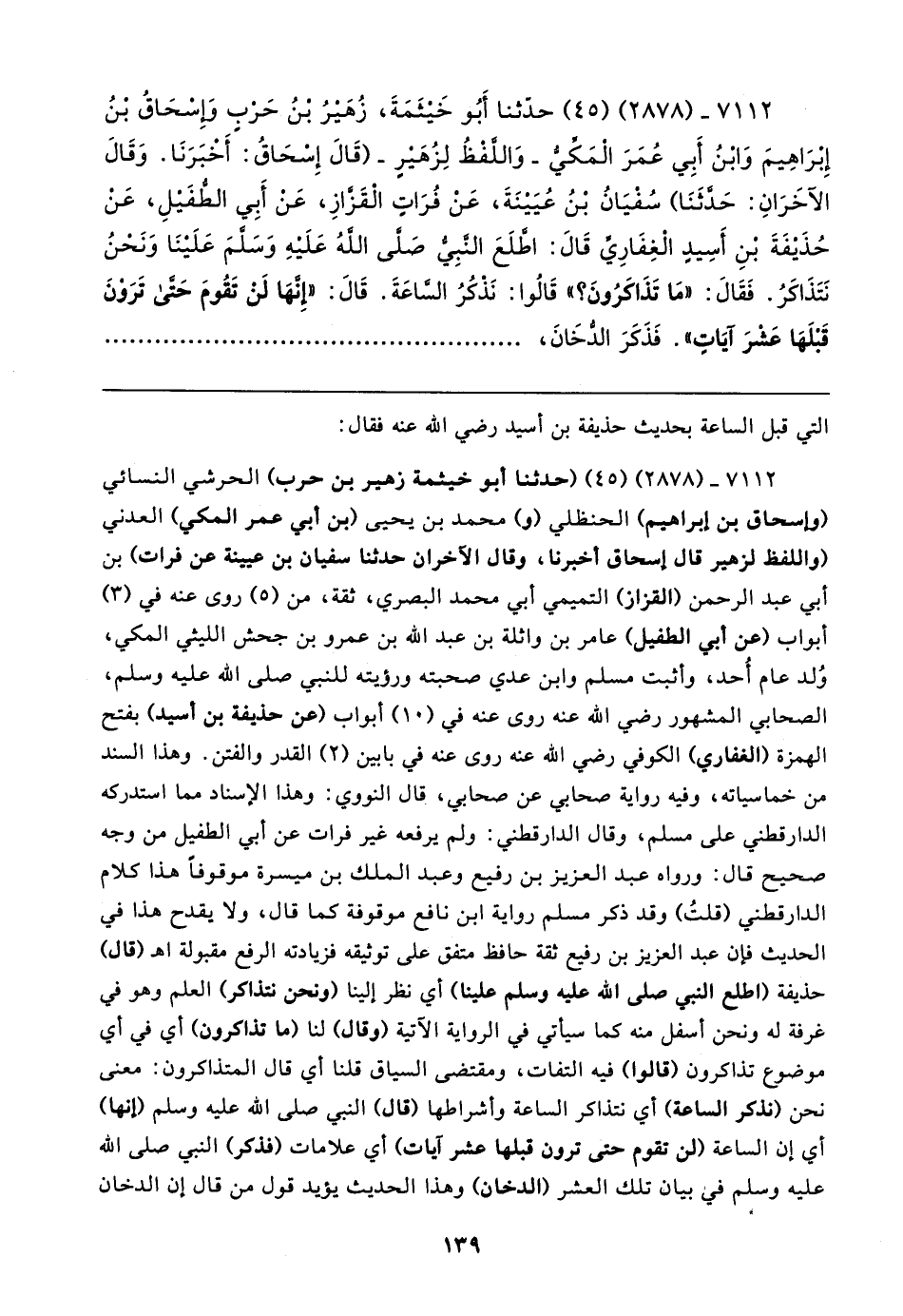 ٧١١٢ - (٢٨٧٨) (٤٥) (حدثنا أبو خيثمة زهير بن حرب) الحرشي النسائي (وإسحاق بن إبراهيم) الحنظلي (و) محمد بن يحيى (بن أبي عمر المكي) العدني (واللفظ لزهير قال إسحاق أخبرنا، وقال الآخران حدثنا سفيان بن عيينة عن فرات) بن أبي عبد الرحمن (القزاز) التميمي أبي محمد البصري، ثقة، من (٥) روى عنه في (٣) أبواب (عن أبي الطفيل) عامر بن واثلة بن عبد الله بن عمرو بن جحش الليثي المكي، وُلد عام أُحد، وأثبت مسلم وابن عدي صحبته ورؤيته للنبي صلى الله عليه وسلم، الصحابي المشهور رضي الله عنه روى عنه في (١٠) أبواب (عن حذيفة بن أسيد) بقح الهمزة (الغفاري) الكوفي رضي الله عنه روى عنه في بابين (٢) القدر والفتن. وهذا السند من خماسياته، وفيه رواية صحابي عن صحابي، قال النووي: وهذا الإسناد مما استدركه الدارقطني على مسلم، وقال الدارقطني: ولم يرفعه غير فرات عن أبي الطفيل من وجه صحيح قال: ورواه عبد العزيز بن رفيع وعبد الملك بن ميسرة موقوفًا هذا كلام الدارقطني (قلتُ) وقد ذكر مسلم رواية ابن نافع موقوفة كما قال، ولا يقدح هذا في الحديث فإن عبد العزيز بن رفيع ثقة حافظ متفق على توثيقه فزيادته الرفع مقبولة اهـ (قال) حذيفة (اطلع النبي صلى الله عليه وسلم علينا) أي نظر إلينا (ونحن نتذاكر) العلم وهو في غرفة له ونحن أسفل منه كما سيأتي في الرواية الآتية (وقال) لنا (ما تذاكرون) أي في أي موضوع تذاكرون (قالوا) فيه التفات، ومقتضى السياق قلنا أي قال المتذاكرون: معنى نحن (ندكر الساعة) أي نتذاكر الساعة وأشراطها (قال) النبي صلى الله عليه وسلم (إنها) أي إن الساعة (لن تقوم حتى ترون قبلها عشر آيات) أي علامات (فذكر) النبي صلى الله عليه وسلم في بيان تلك العشر (الدخان) وهذا الحديث يؤيد قول من قال إن الدخان