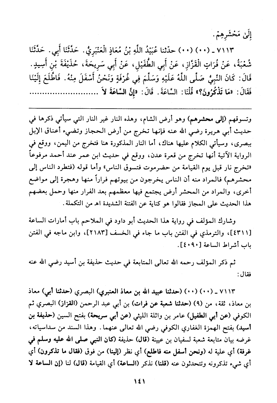 ٧١١٣ - (٠٠) (٠٠) حدثنا عُبَيدُ اللهِ بن مُعَاذٍ العَنْبَرِيُّ. حَدَّثَنَا أَبِي. حَدَّثَنَا شُعبَةُ، عَن فُرَاتٍ الْقَزَّازِ، عَنْ أَبِي الطُّفَيلِ، عَن أبِي سَرِيحَةَ، حُذَيفَةَ بنِ أَسِيدٍ. قَال: كَانَ النَّبِيُّ صَلى اللهُ عَلَيهِ وَسَلَّمَ فِي غُرفَةٍ وَنَحْنُ أَسفَلَ مِنهُ. فَاطَّلَعَ إِلَينَا فَقَال: "مَا تَذْكُرُونَ؟ " قُلْنَا: الساعَةَ. قَال: "إِن الساعَةَ لَا