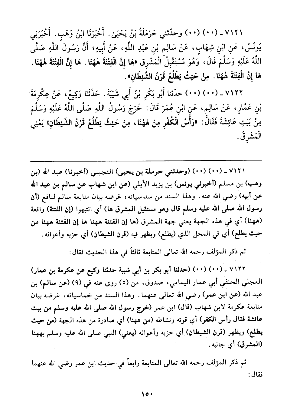 ٧١٢١ - (٠٠) (٠٠) وحدثني حَرْمَلَةُ بن يَحيَى. أخبَرَنَا ابنُ وَهبٍ. أَخبَرَنِي يُونُسُ، عَنِ ابْنِ شِهَابٍ، عَنْ سَالِمِ بنِ عَبْدِ اللهِ، عَنْ أَبِيهِ؛ أَن رَسُولَ اللهِ صَلَّى اللهُ عَلَيهِ وَسَلمَ قَال، وَهُوَ مُسْتَقْبِلُ المَشرِق "هَا إِنَّ الْفِتْنَةَ ههُنَا. هَا إِن الْفِتنَةَ ههُنَا. هَا إِنَّ الفِتنَةَ ههُنَا. مِن حَيثُ يَطلُعُ قَرْنُ الشيطَانِ".