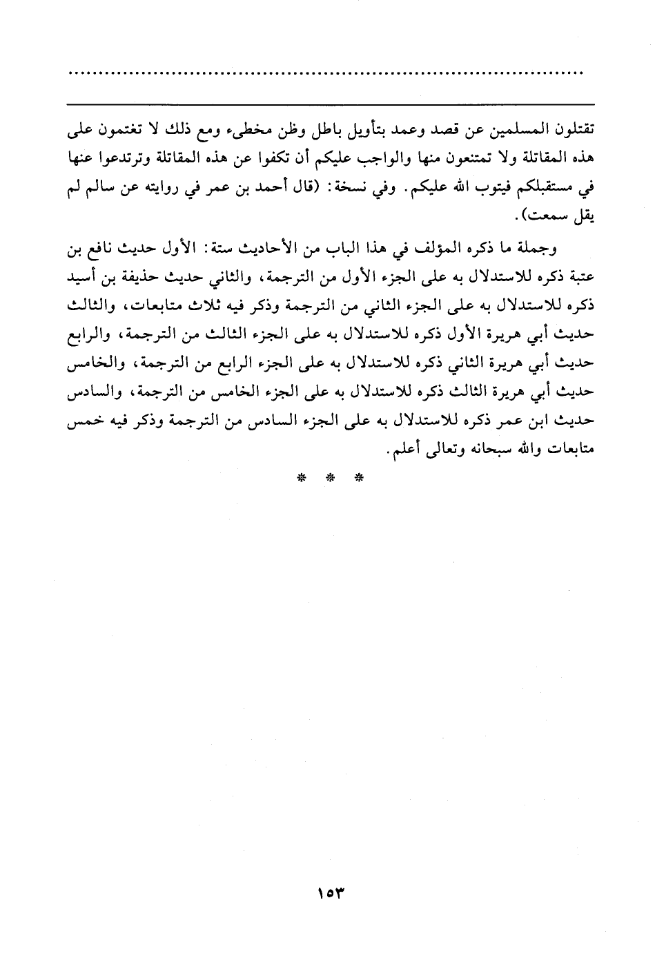 تقتلون المسلمين عن قصد وعمد بتأويل باطل وظن مخطئ ومع ذلك لا تغتمون على هذه المقاتلة ولا تمتنعون منها والواجب عليكم أن تكفوا عن هذه المقاتلة وترتدعوا عنها في مستقبلكم فيتوب الله عليكم. وفي نسخة: (قال أحمد بن عمر في روايته عن سالم لم يقل سمعت).