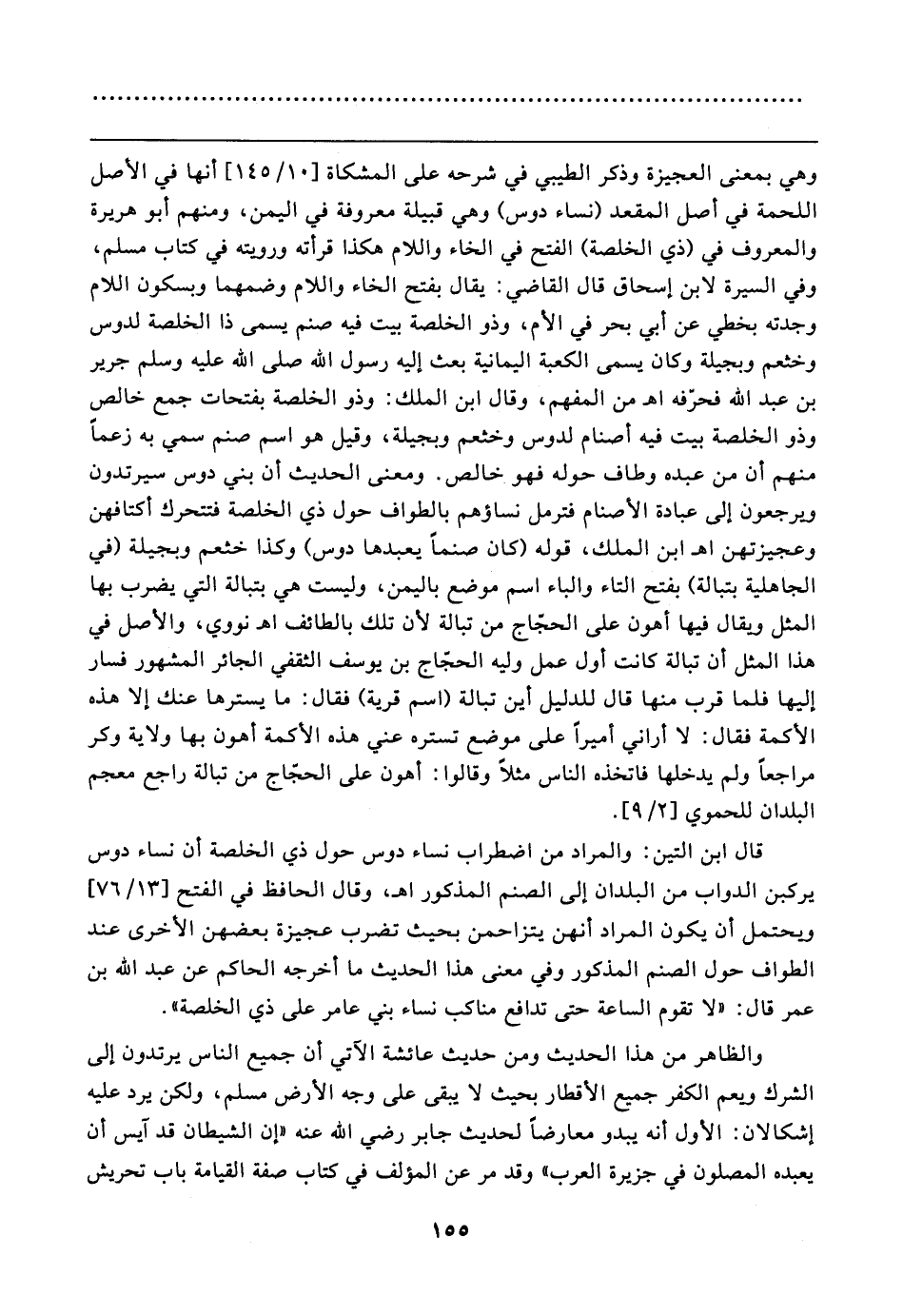 وهي بمعنى العجيزة وذكر الطيبي في شرحه على المشكاة [١٠/ ١٤٥] أنها في الأصل اللحمة في أصل المقعد (نساء دوس) وهي قبيلة معروفة في اليمن، ومنهم أبو هريرة والمعروف في (ذي الخلصة) الفتح في الخاء واللام هكذا قرأته ورويته في كتاب مسلم، وفي السيرة لابن إسحاق قال القاضي: يقال بفتح الخاء واللام وضمهما وبسكون اللام وجدته بخطي عن أبي بحر في الأم، وذو الخلصة بيت فيه صنم يسمى ذا الخلصة لدوس وخثعم وبجيلة وكان يسمى الكعبة اليمانية بعث إليه رسول الله صلى الله عليه وسلم جرير بن عبد الله فحرّفه اهـ من المفهم، وقال ابن الملك: وذو الخلصة بفتحات جمع خالص وذو الخلصة بيت فيه أصنام لدوس وخثعم وبجيلة، وقيل هو اسم صنم سمي به زعمًا منهم أن من عبده وطاف حوله فهو خالص. ومعنى الحديث أن بني دوس سيرتدون ويرجعون إلى عبادة الأصنام فترمل نساؤهم بالطواف حول ذي الخلصة فتتحرك أكتافهن وعجيزتهن اهـ ابن الملك، قوله (كان صنمًا يعبدها دوس) وكذا خثعم وبجيلة (في الجاهلية بتبالة) بفتح التاء والباء اسم موضع باليمن، وليست هي بتبالة التي يضرب بها المثل ويقال فيها أهون على الحجاج من تبالة لأن تلك بالطائف اهـ نووي، والأصل في هذا المثل أن تبالة كانت أول عمل وليه الحجاج بن يوسف الثقفي الجائر المشهور فسار إليها فلما قرب منها قال للدليل أين تبالة (اسم قرية) فقال: ما يسترها عنك إلا هذه الأكمة فقال: لا أراني أميرا على موضع تستره عني هذه الأكمة أهون بها ولاية وكر مراجعًا ولم يدخلها فاتخذه الناس مثلا وقالوا: أهون على الحجاج من تبالة راجع معجم البلدان للحموي [٢/ ٩].