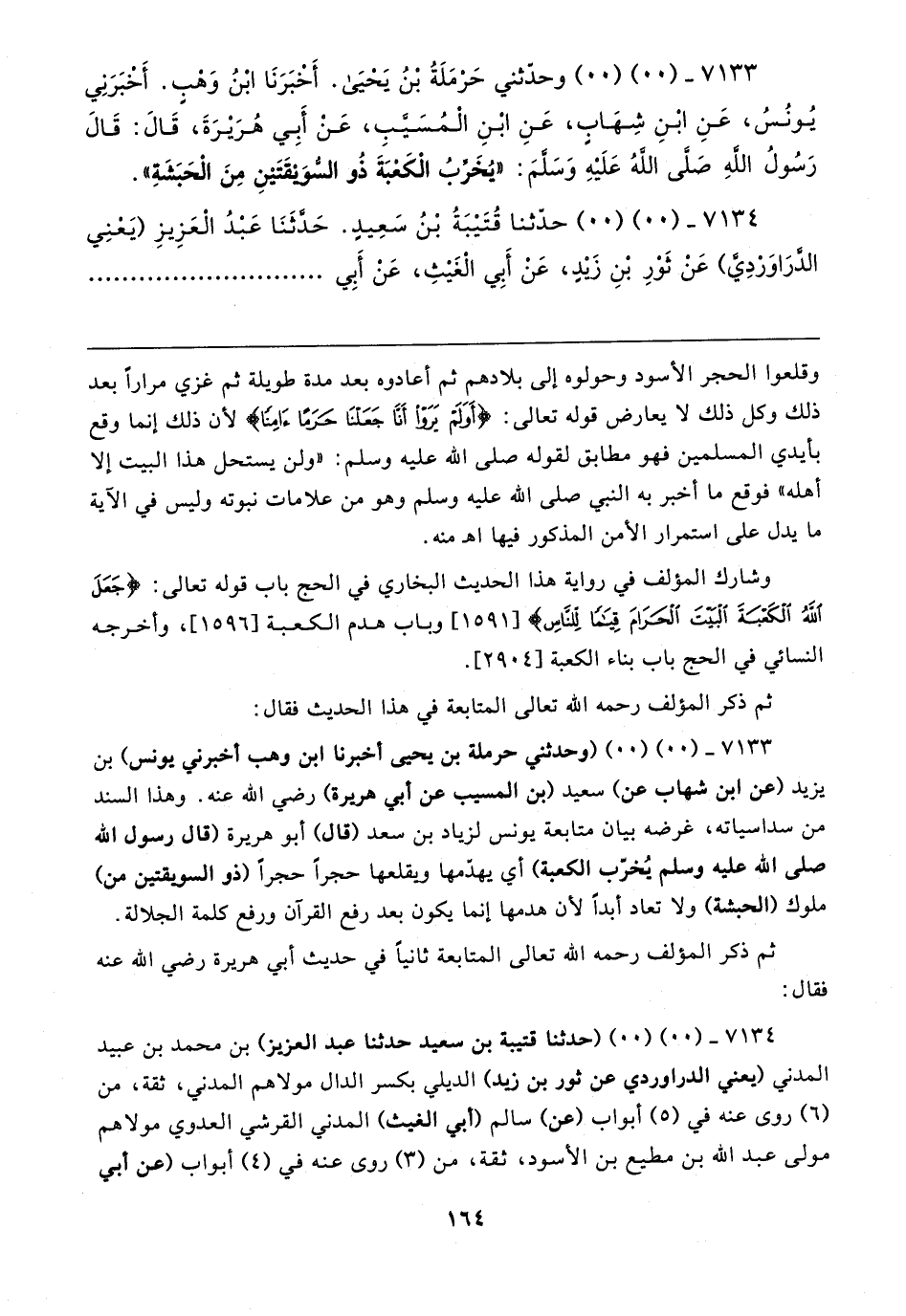 ٧١٣٣ - (٠٠) (٠٠) وحدثني حَرْمَلَةُ بْنُ يَحيَى. أَخبَرَنَا ابْنُ وَهبٍ. أَخبَرَنِي يُونُسُ، عَنِ ابْنِ شِهَابٍ، عَنِ ابْنِ الْمُسَيَّبِ، عَنْ أَبِي هُرَيرَةَ، قَال: قَال رَسُولُ اللهِ صَلَى اللهُ عَلَيهِ وَسَلمَ: "يُخَرِّبُ الْكَعْبَةَ ذُو السُّوَيقَتَينِ مِنَ الْحَبَشَةِ".