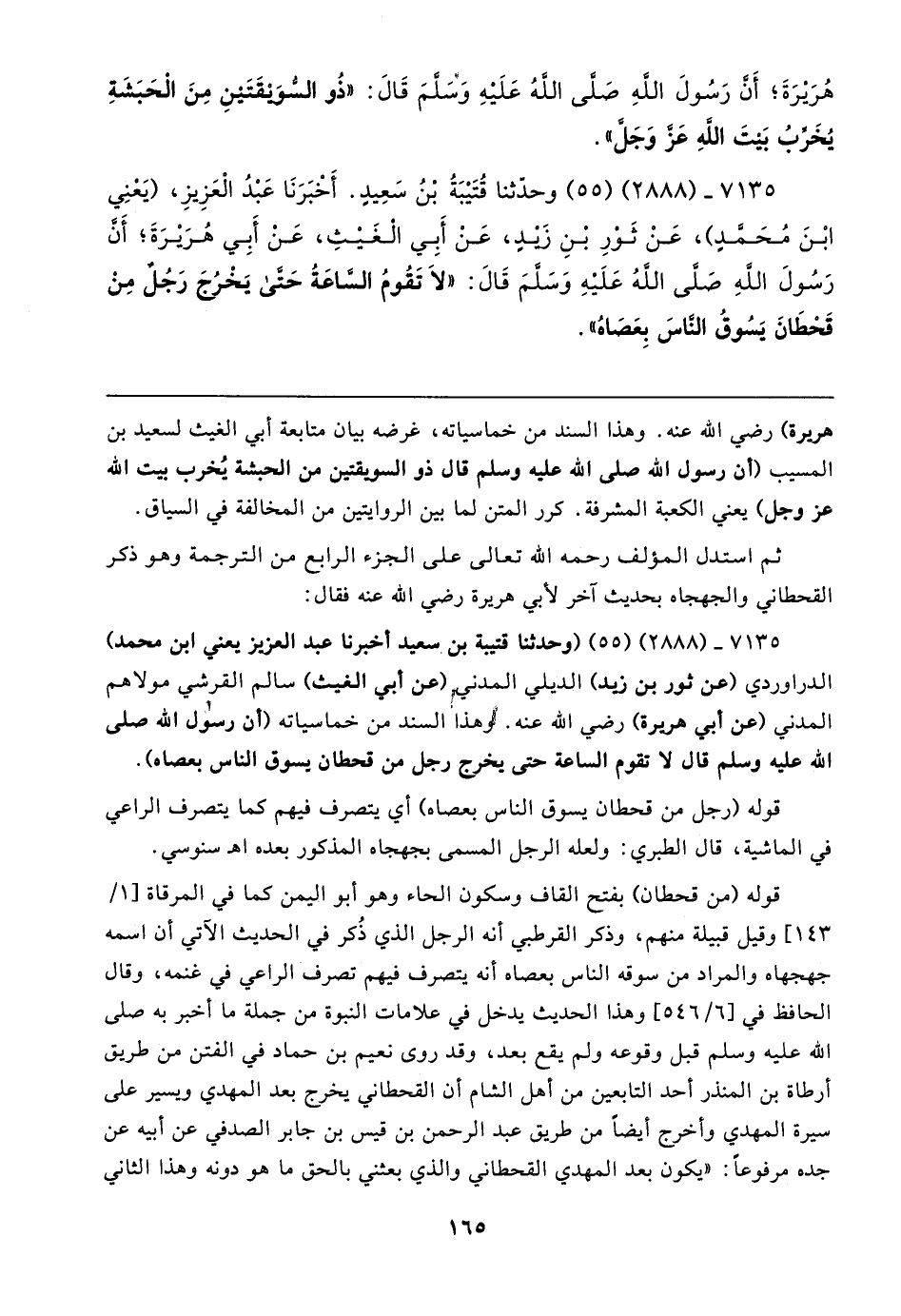 ٧١٣٥ - (٢٨٨٨) (٥٥) (وحدثنا قتيبة بن سعيد أخبرنا عبد العزيز يعني ابن محمد) الدراوردي (عن ثور بن زيد) الديلي المدني (عن أبي الغيث) سالم القرشي مولاهم المدني (عن أبي هريرة) رضي الله عنه. هذا السند من خماسياته (أن رسول الله صلى الله عليه وسلم قال لا تقوم الساعة حتى يخرج رجل من قحطان يسوق الناس بعصاه).